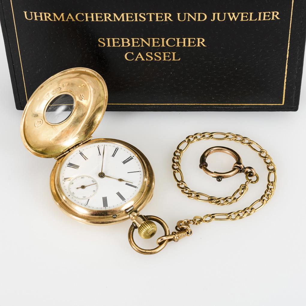 In schwarzem Etui "Uhrmachermeister und Juwelier Siebeneicher Cassel" mit Ersatzglas.