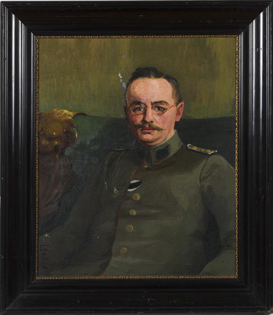 Bildnis des Arztes während der Kriegsgefangenschaft. Später Leiter des Krankenhauses Siegen. Siehe auch Katalog-Nr. 2644. Ein Relief zur Hochzeit des Dargestellten von seinem Bruder Ferdinand Flosdorf. Farbabsplitterungen.