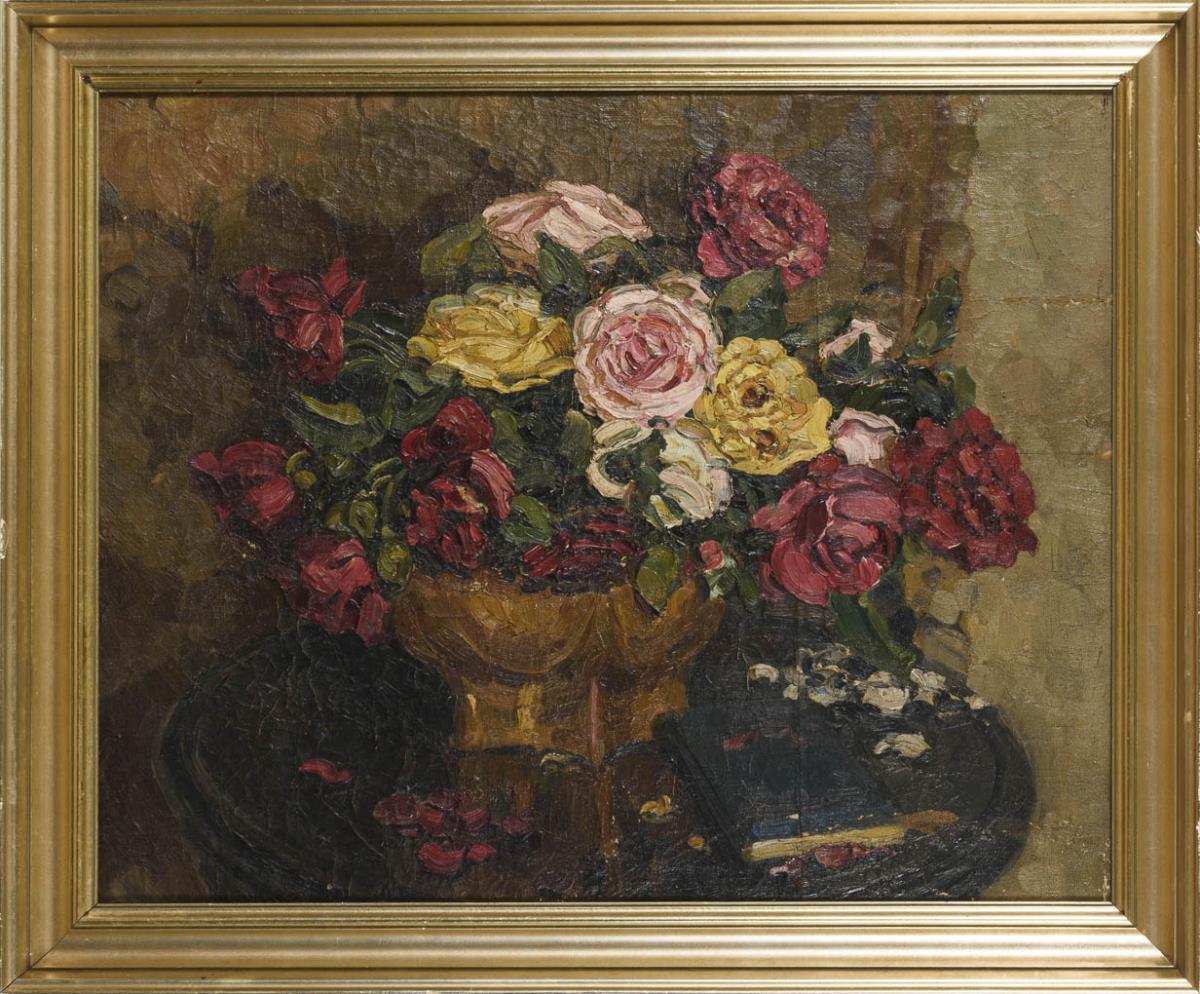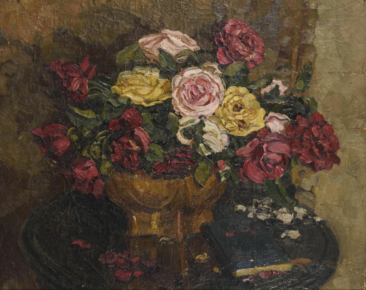 Rosen in einer breiten Schale auf einem runden Tisch mit einem Buch. Altersspuren, Farbabsplitterungen.