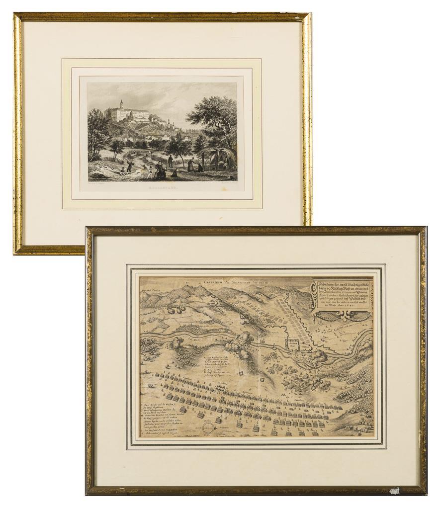 Blick auf 2 Feldlager bei Saalfeld, bezeichnet "Castrorvm Ad Salfeldivm Sitvatio [...] 1640", aus Matthäus Merians "Theatrum Europaeum" (1633 - 1738), Passepartoutausschnitt 25 x 36 cm, verglast und gerahmt 42 x 53 cm, Bugfalte, stockfleckig | Blick auf Schloss Heidecksburg von Westen, bezeichnet "Rudolstadt", Stahlstich, gezeichnet von O. Wagner und gestochen von H. Wallis, 1837, Platte: 10,3 x 15,4 cm, verglast und gerahmt: 25,5 x 30,7 cm, gering stockfleckig.