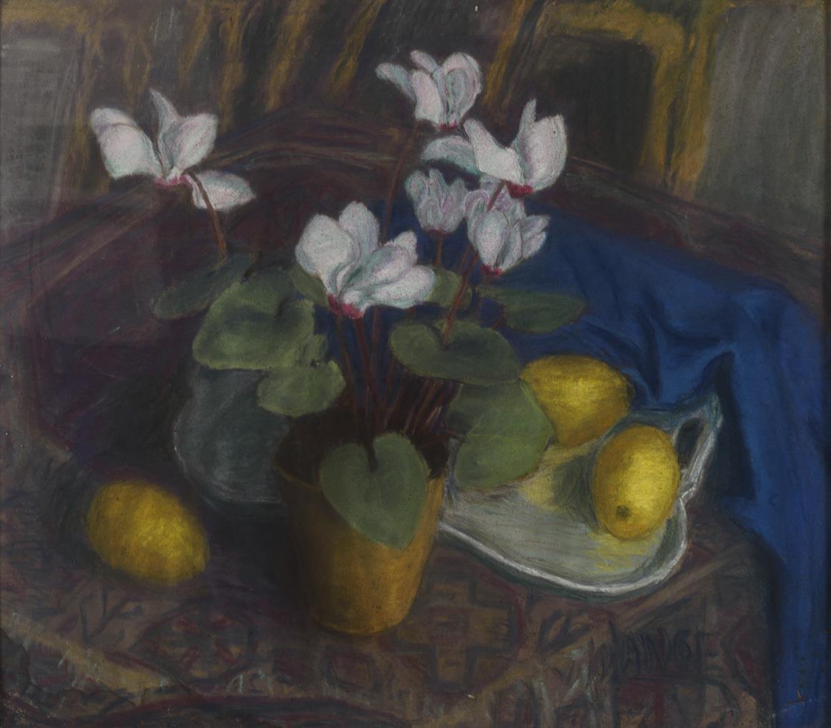Alpenveilchen in einem Topf auf einem Tisch neben einem Tablett mit Zitronen.
