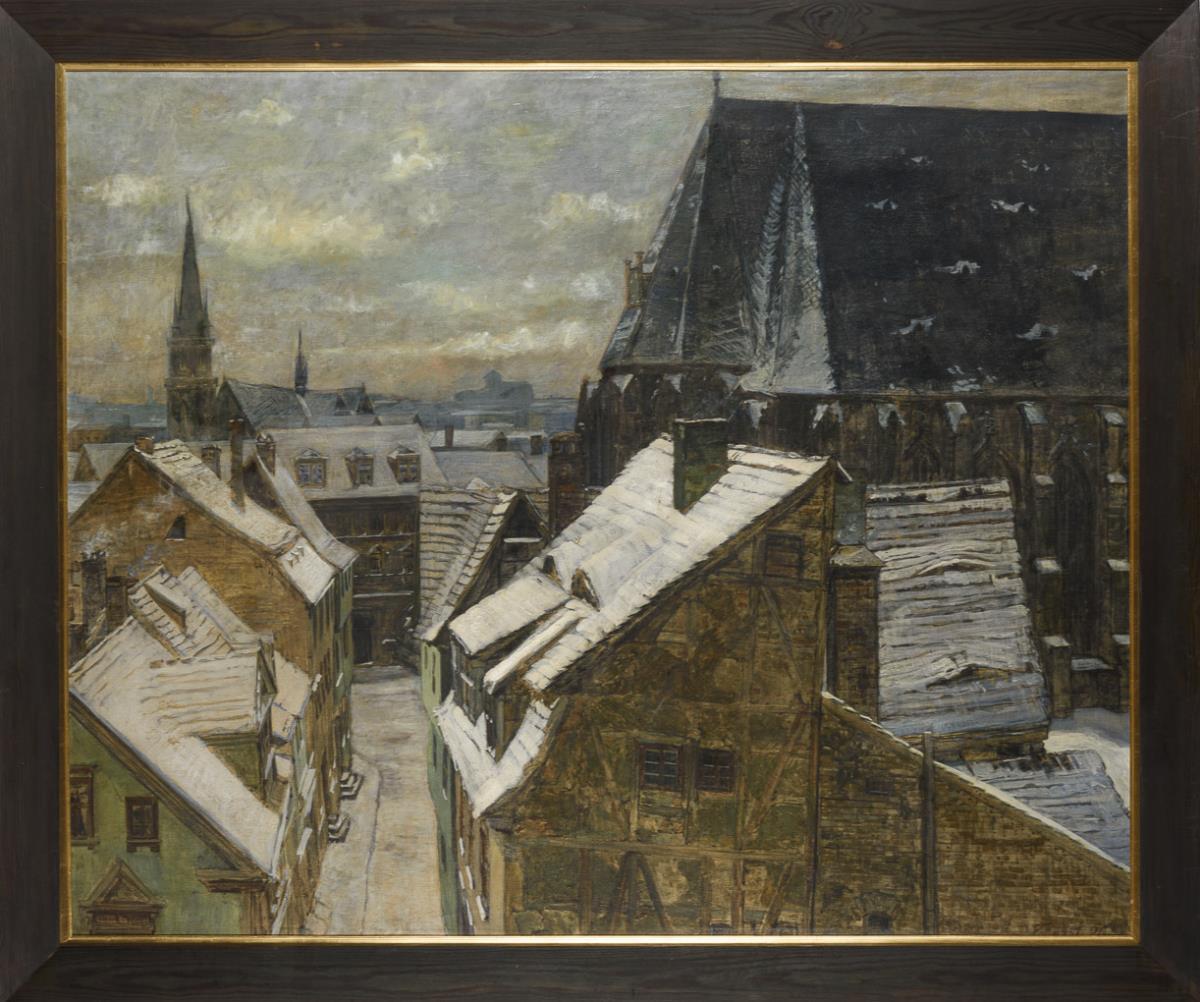 Blick über die Dächer der Stadt im Winter unter einem leicht bewölkten Himmel.