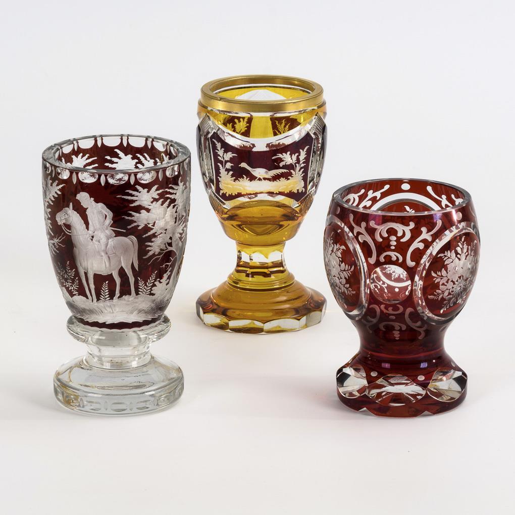 1x Pokal mit Rotbeize: umlaufend eine gravierte Landschaft mit Reiter. / 1x Pokal mit Gelb- und Rotbeize: mit drei gravierten Landschaftsdarstellungen mit Architektur bzw. Vögeln. / 1x Pokal mit Rotbeize: mit floraler Gravur. 1x mit Randbestoßung.