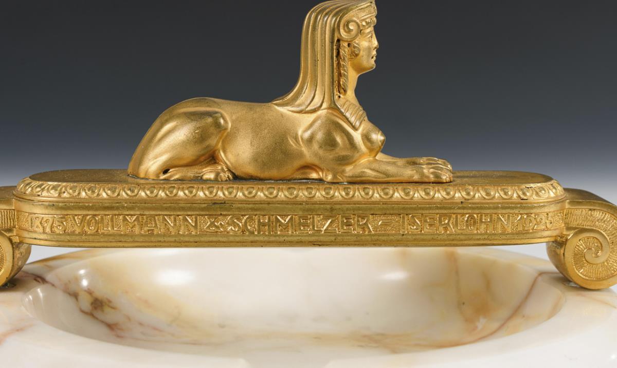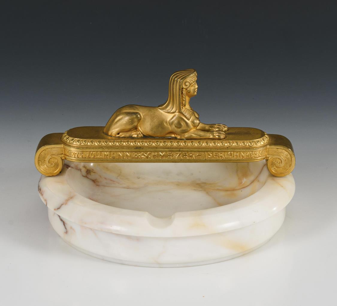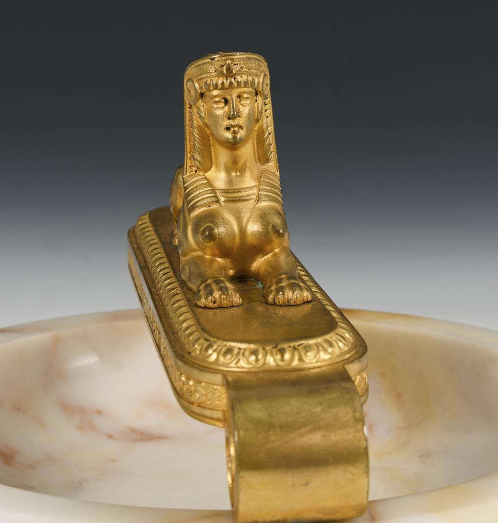 Runde Marmorschale, montierter Bronze-Bügel mit liegender weiblicher Sphinx. Vergoldung berieben.