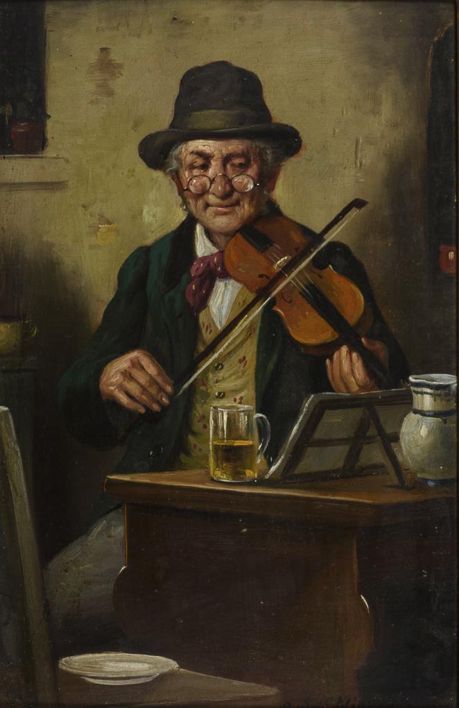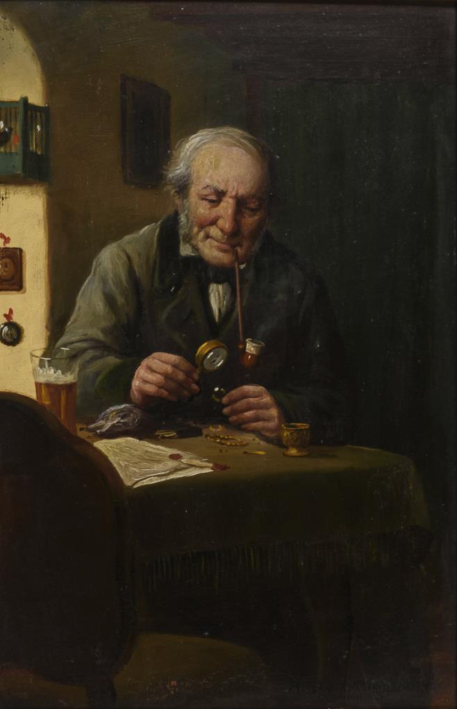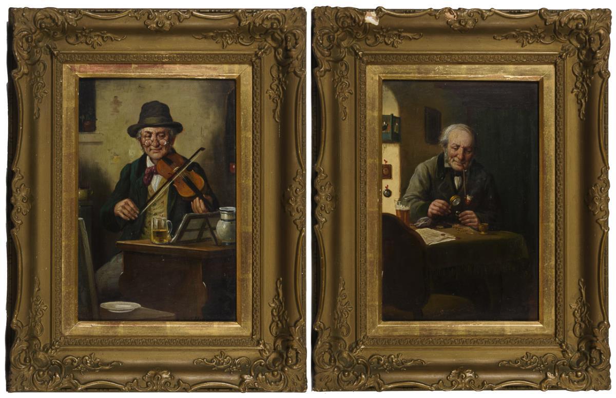 Bildnisse eines Geigenspielers mit Bierglas sowie eines Juweliers beim Begutachten des Schmucks.