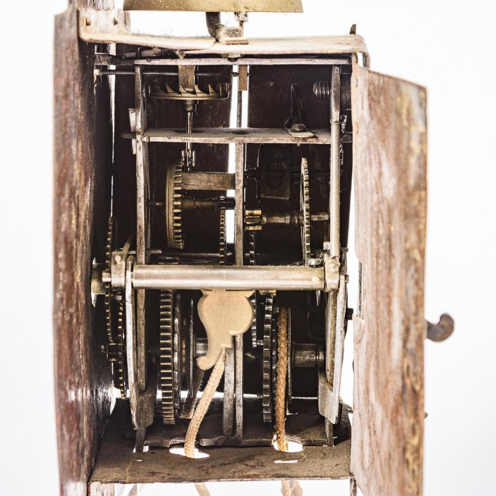 Messingräderwerk mit Spindelgang und Schlag auf Glocke. Funktion nicht geprüft, revisionsbedürftig. Weißes Zifferblatt mit römischen Zahlen, arabischen Viertelstunden und gesägten Messingzeigern, Kuhschwanzpendel.
