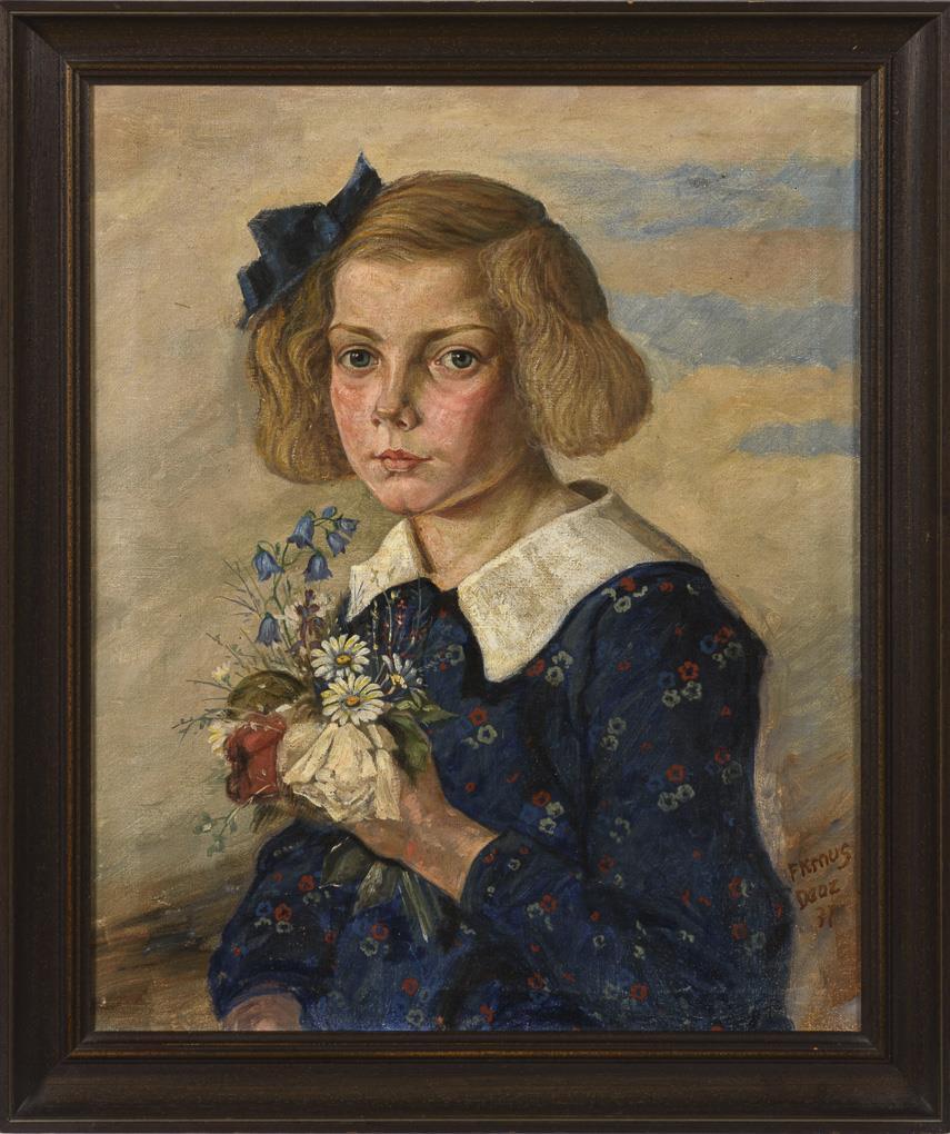 Porträt eines Mädchens im blauen Kleid mit blondem Haar und Wiesenstrauß in der Hand. Eine sehr kleine restaurierte Stelle.