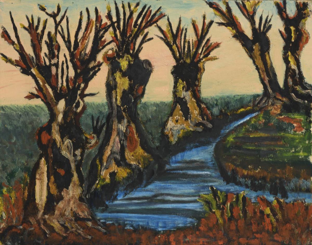Bachlauf in weiter Ebene mit den kahlen Bäumen am Ufer. Kleine Defekte.