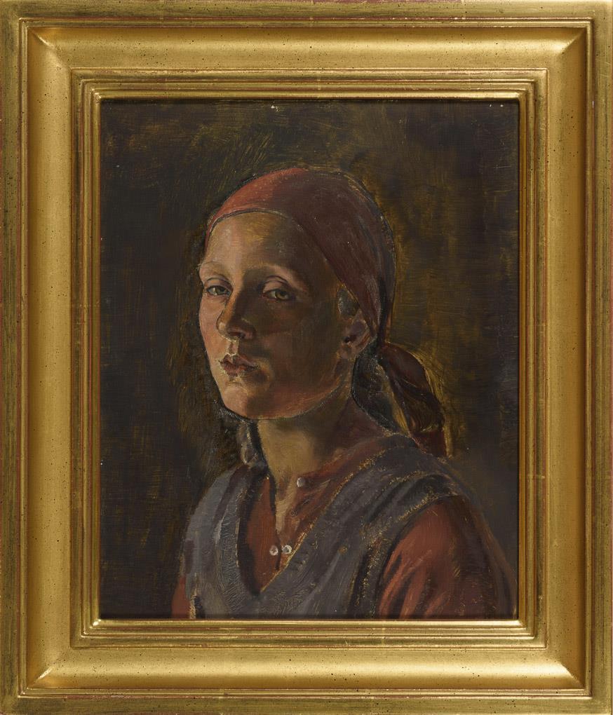 Junge Frau in ländlicher Kleidung mit rotem Kopftuch. Leichte Altersspuren.