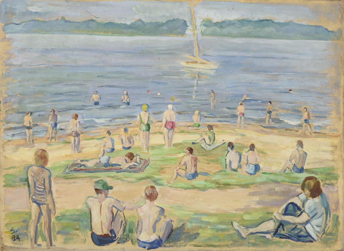 Viele Menschen im gleißenden Sonnenlicht am Strand und im Wasser. Minimale Altersspuren.