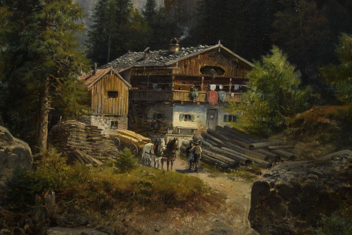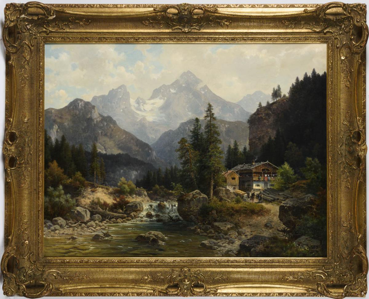 Alpenhaus am Gebirgsfluss mit Blick zum Watzmann am Horizont. Leichte Altersspuren.