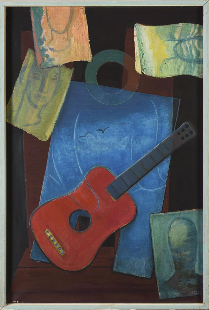 Stillleben mit Gitarre und verschiedenen Zeichnungen und Gemälden. Altersspuren.