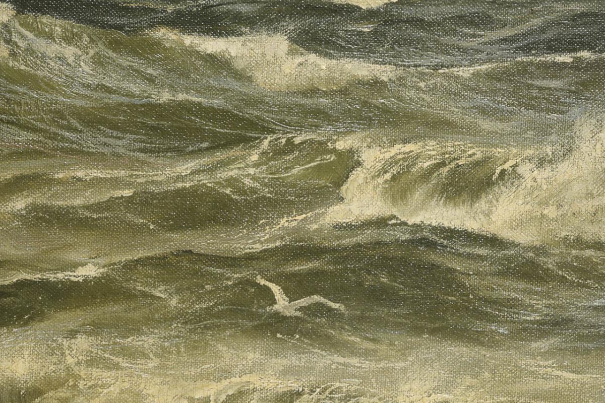 Felsiger Strand mit hohen Wellen unter leicht bewölktem Himmel. Minimale Altersspuren.