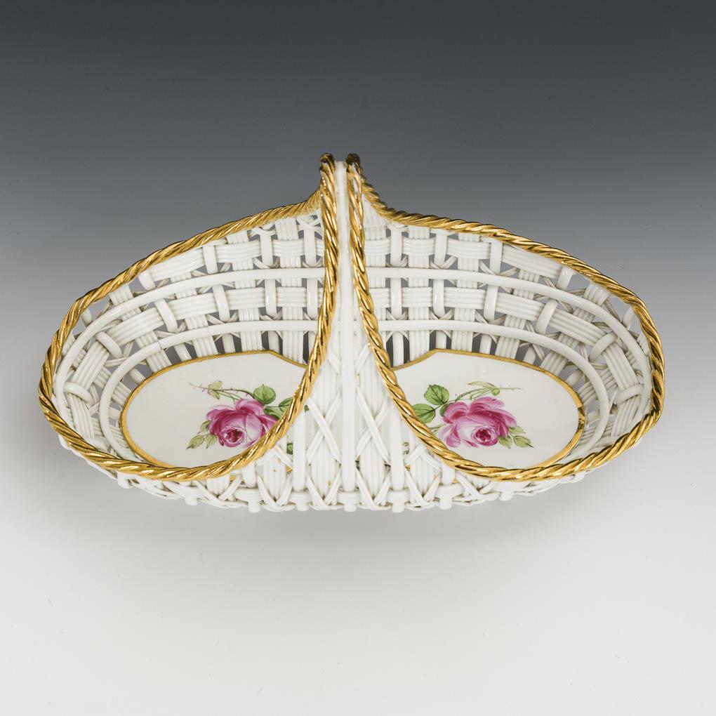 Ovaler Flechtkorb mit hohem Henkel, im Spiegel gemalte Rosenstängel. 1 kleine Bestoßung am Korb, minimaler Goldabrieb.