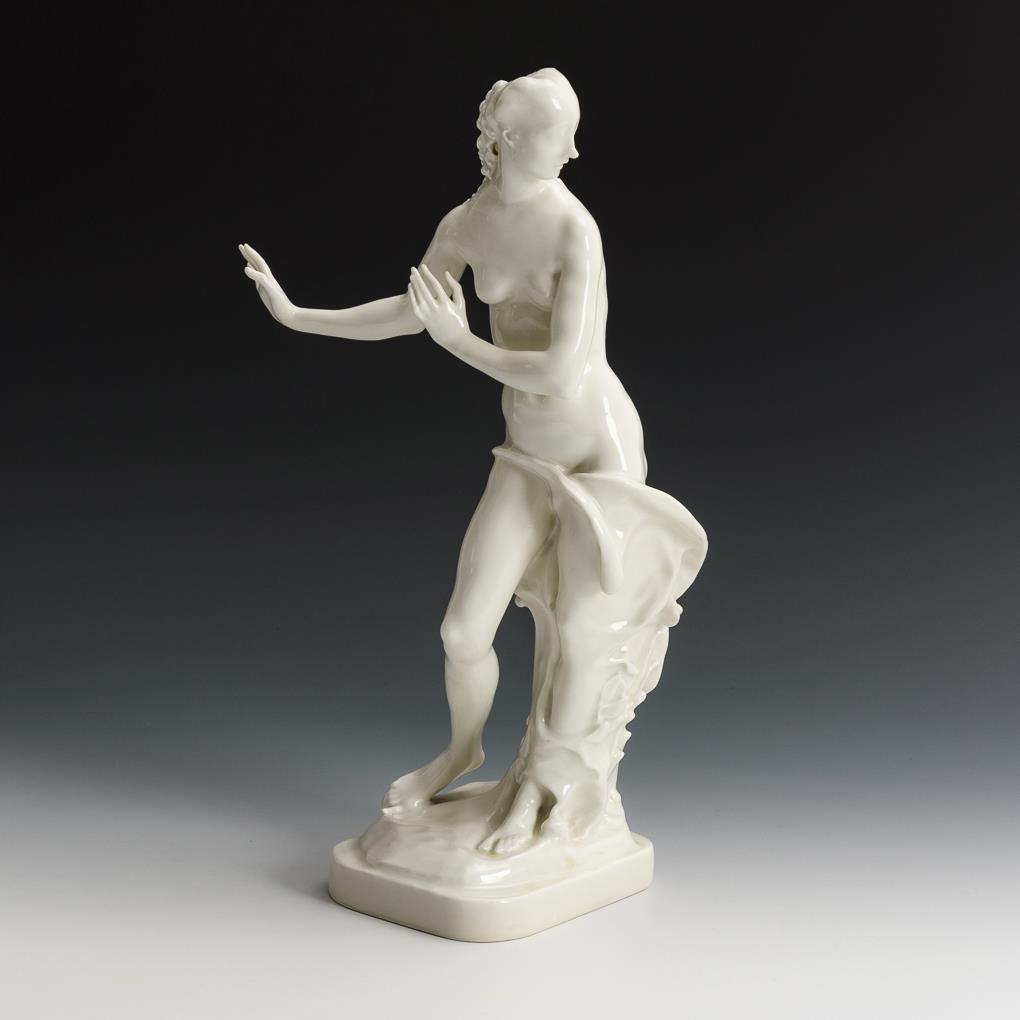 Stehender Frauenakt, die Hände abwehrend erhoben. Rechte Hand restauriert.