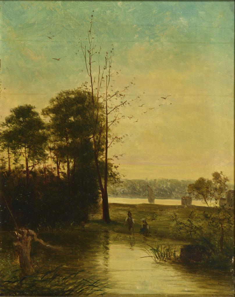 Abendlandschaft mit Fischern an einem Weiher sowie Flusslandschaft mit Kirche und Staffage vor Sonnenuntergang. Eine kleine restaurierte Stelle mit Hinterklebungen.