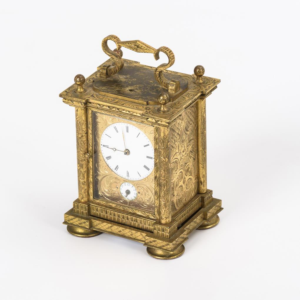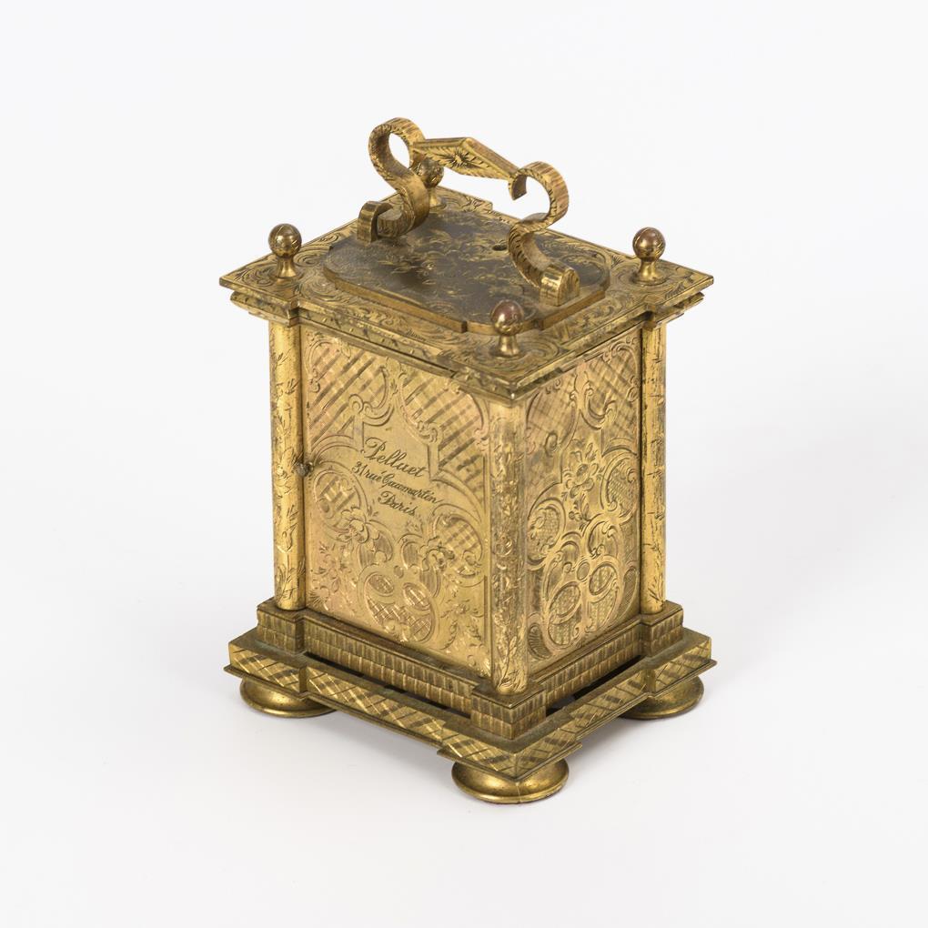 Allseitig floral graviertes Gehäuse mit Ecksäulen, bekrönenden Zierkugeln und geschweiftem Tragebügel. Frontseitig verglast. Verso bezeichnet "Pelluet, 31 rue Caumartin, Paris". Zifferblatt leicht haarrissig, Gehäuse berieben, 1 Fuß gelockert.