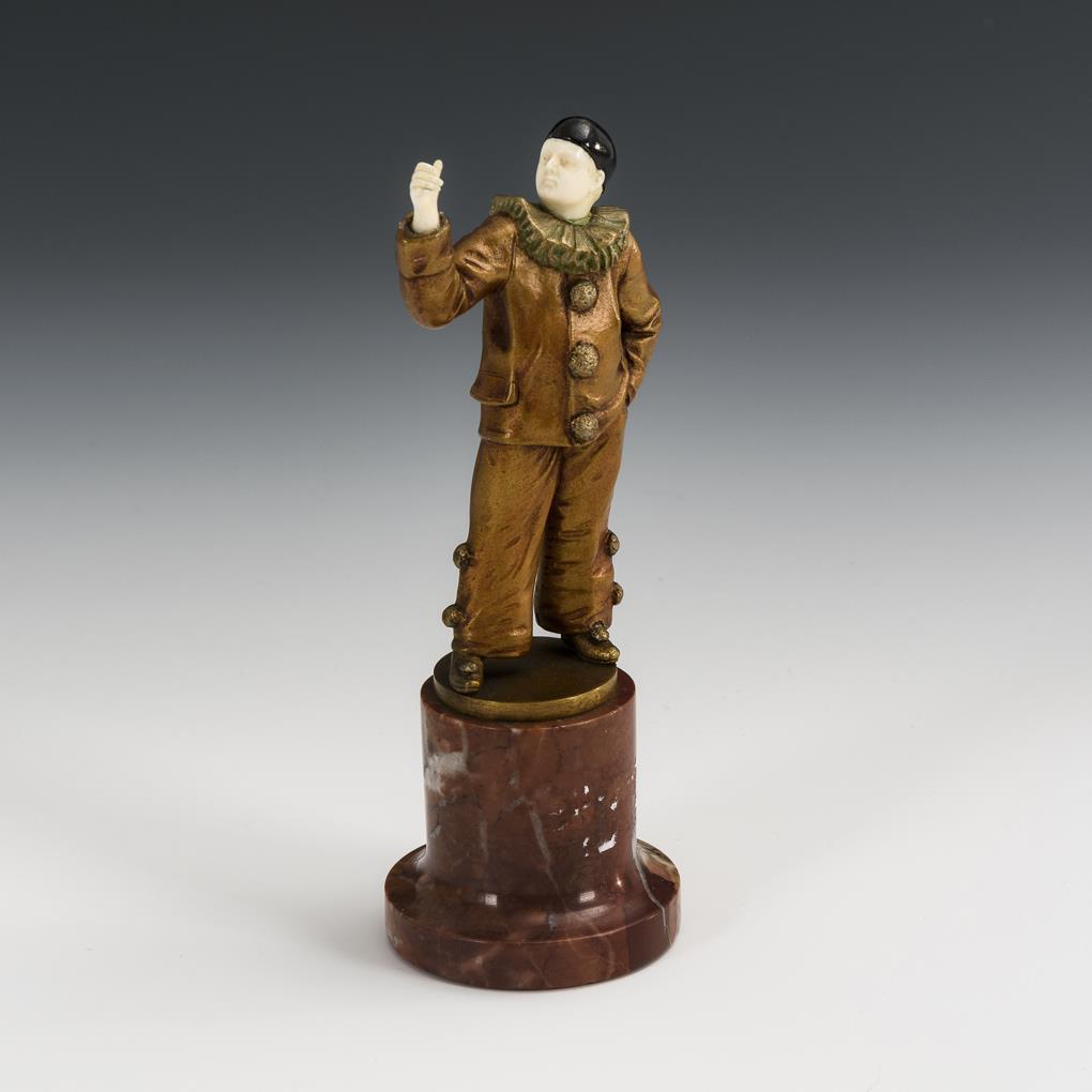 Zu seiner erhobenen rechten Hand blickender Pierrot im Kostüm. Attribut fehlt.