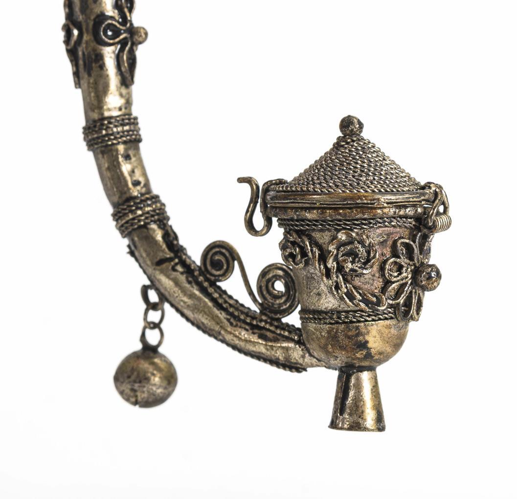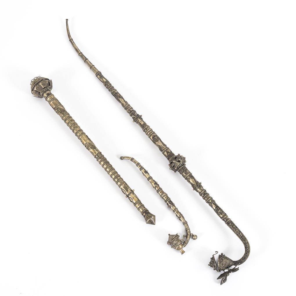 Lange Pfeife mit durchbrochen gearbeitetem Nodus. Am kleinen Kessel mit Scharnierdeckel ein filigraner Schmetterling. / Kleine Pfeife mit Kugelabhängung. / Pfeife mit Kugelkessel und abnehmbarem Zapfen am Mundstück. Alle reich mit Filigrandrahtmustern verziert.