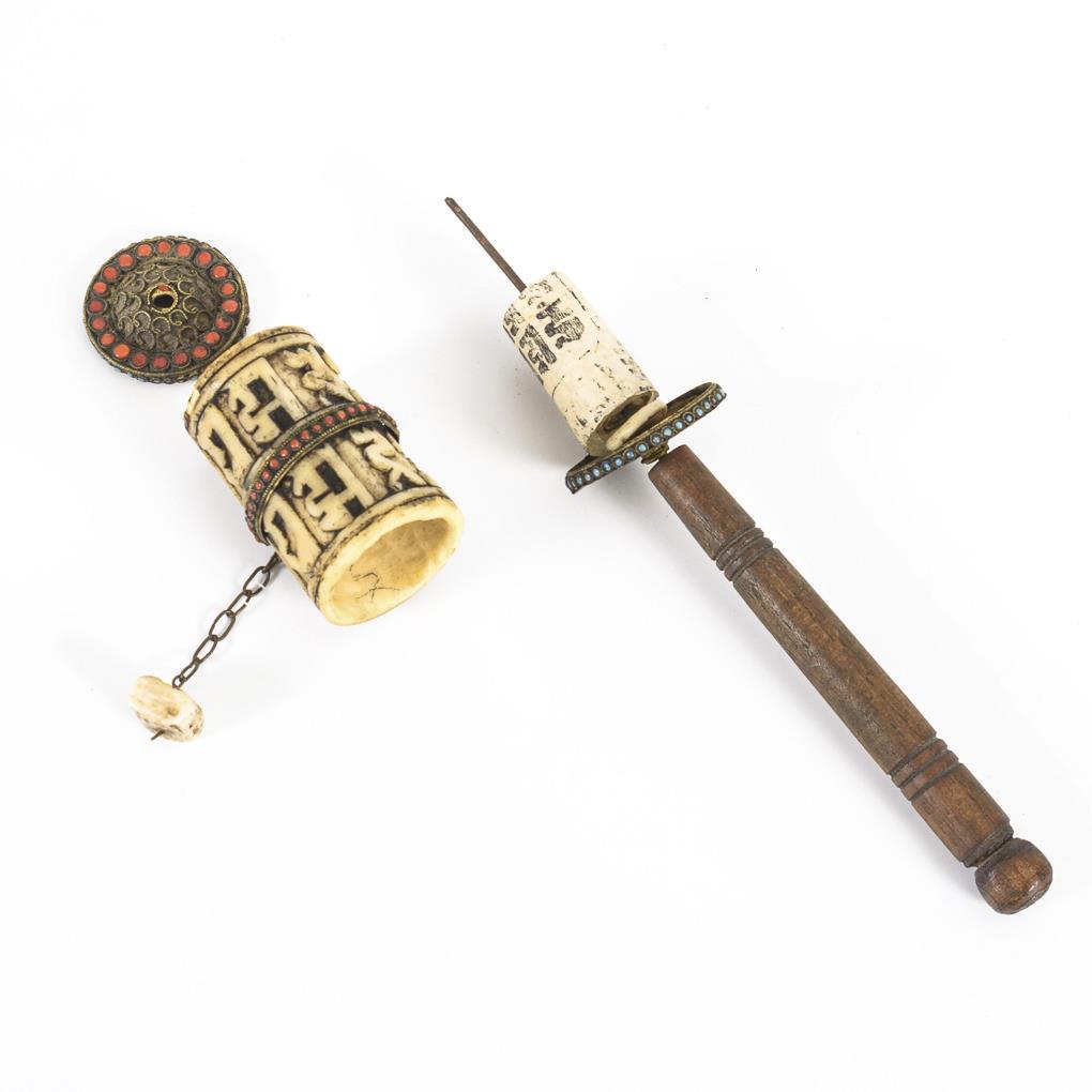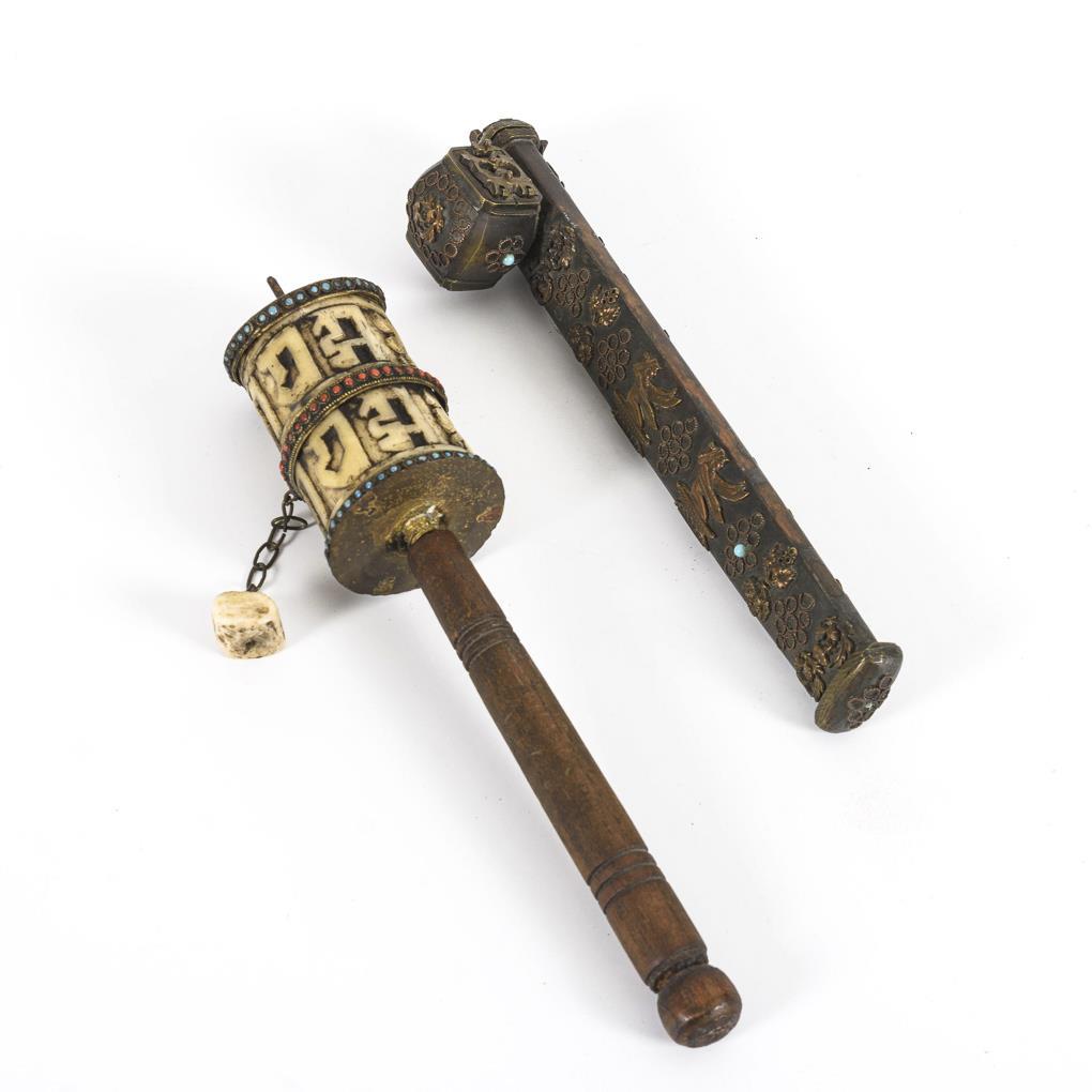 Gebetsmühle: Korpus aus Bein mit Schriftzeichen in Reliefschnitzerei. Besetzt mit Türkisen und Korallen. Innen beschriebene Papierrolle. Deckel lose. L 22 cm. / Hülse für Schreibutensilien mit Tintenfass. Metall mit teils artfremden Applikationen und türkisem Steinbesatz. Fässchen mit kleinem, verschließbarem Scharnierdeckel.
