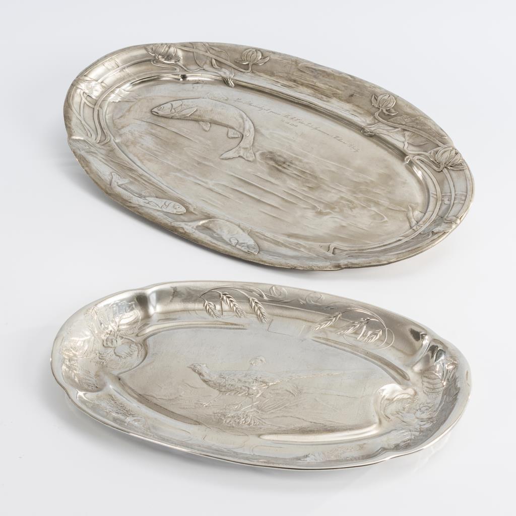 Große Bitter & Gobbers-Platte mit Fischen, Kayserzinnplatte mit Fasanen reliefiert. Die große Platte mit gravierter Widmung von 1910 und Ortsangabe Ostritz. Große Platte mit angelöteten Hängeösen und kleinem Riss in der Fahne, je Alters-/ Gebrauchsspuren.
