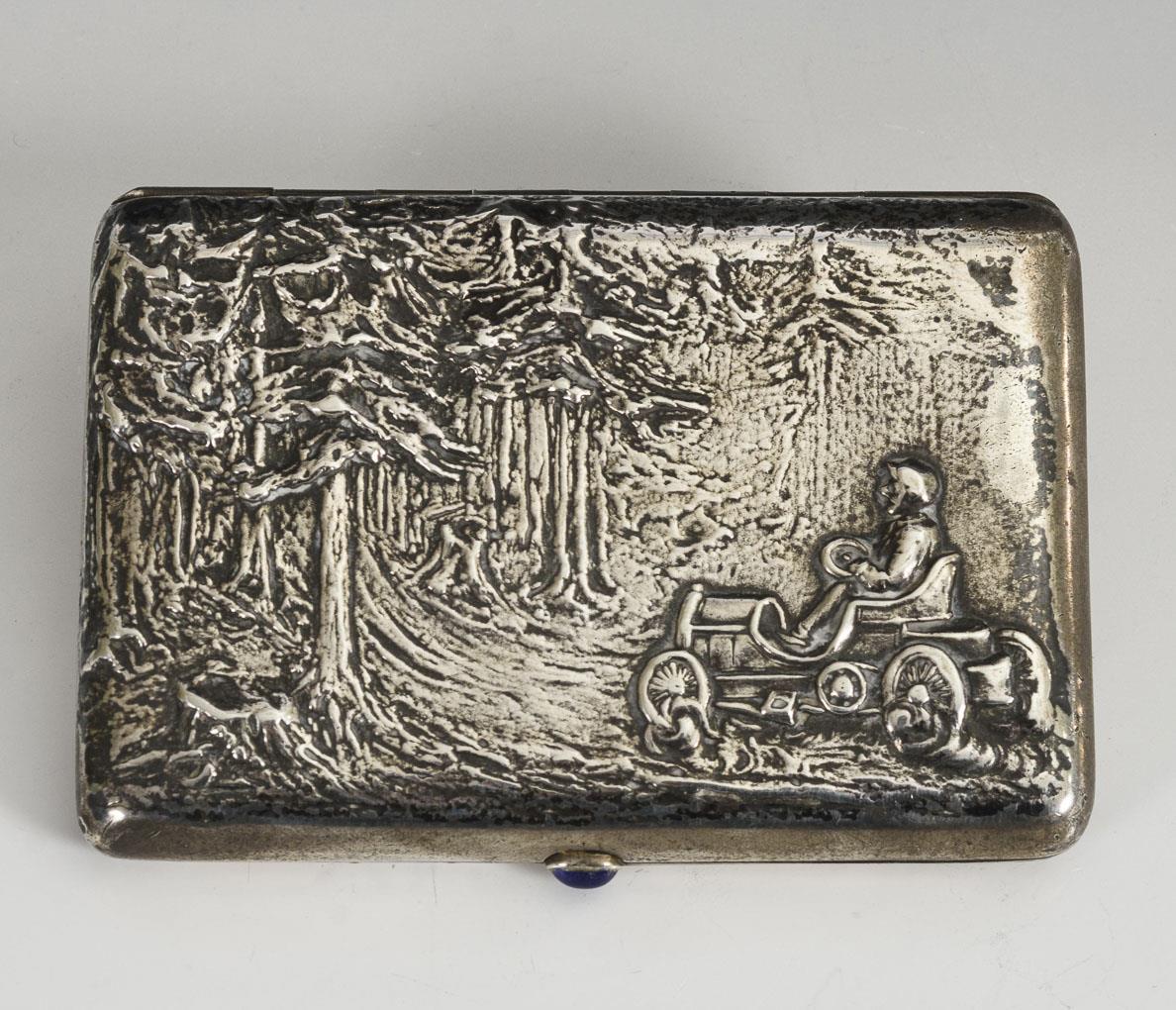Reliefierter Deckel mit Autofahrer im Wald, unterseitig vergoldete Monogramm-Auflage "RS". Gebrauchsspuren.