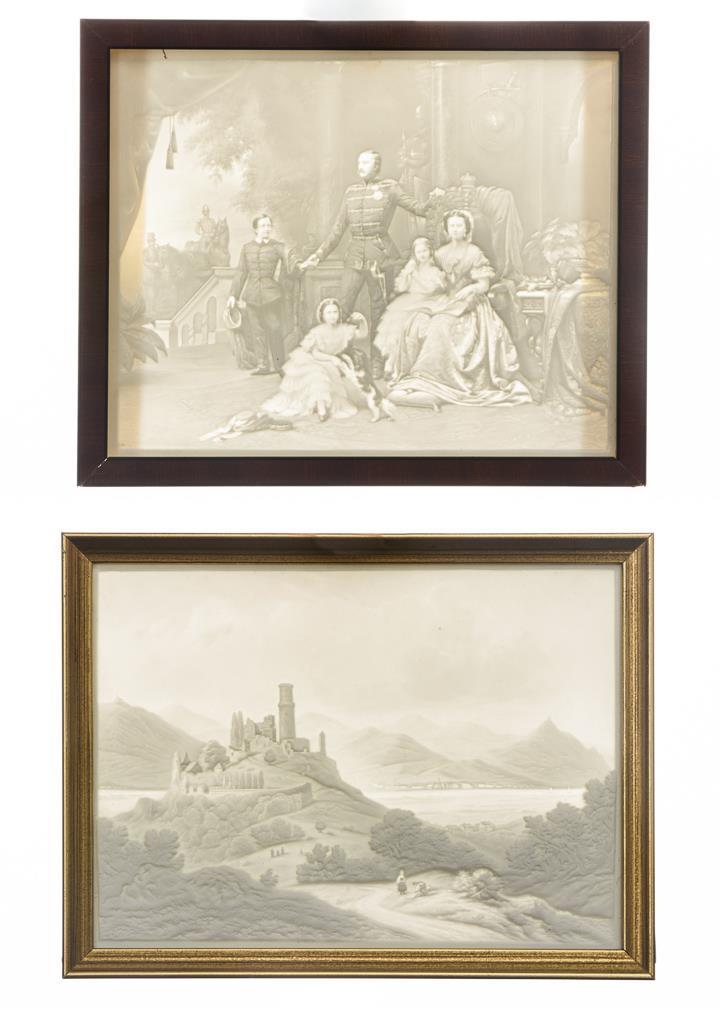 1x die Darstellung einer bergigen Landschaft mit See und Burgruine. / 1x die Darstellung des Königs Georg V. von Hannover im Kreise seiner Familie, nach einem Gemälde von Wilhelm von Kaulbach.
