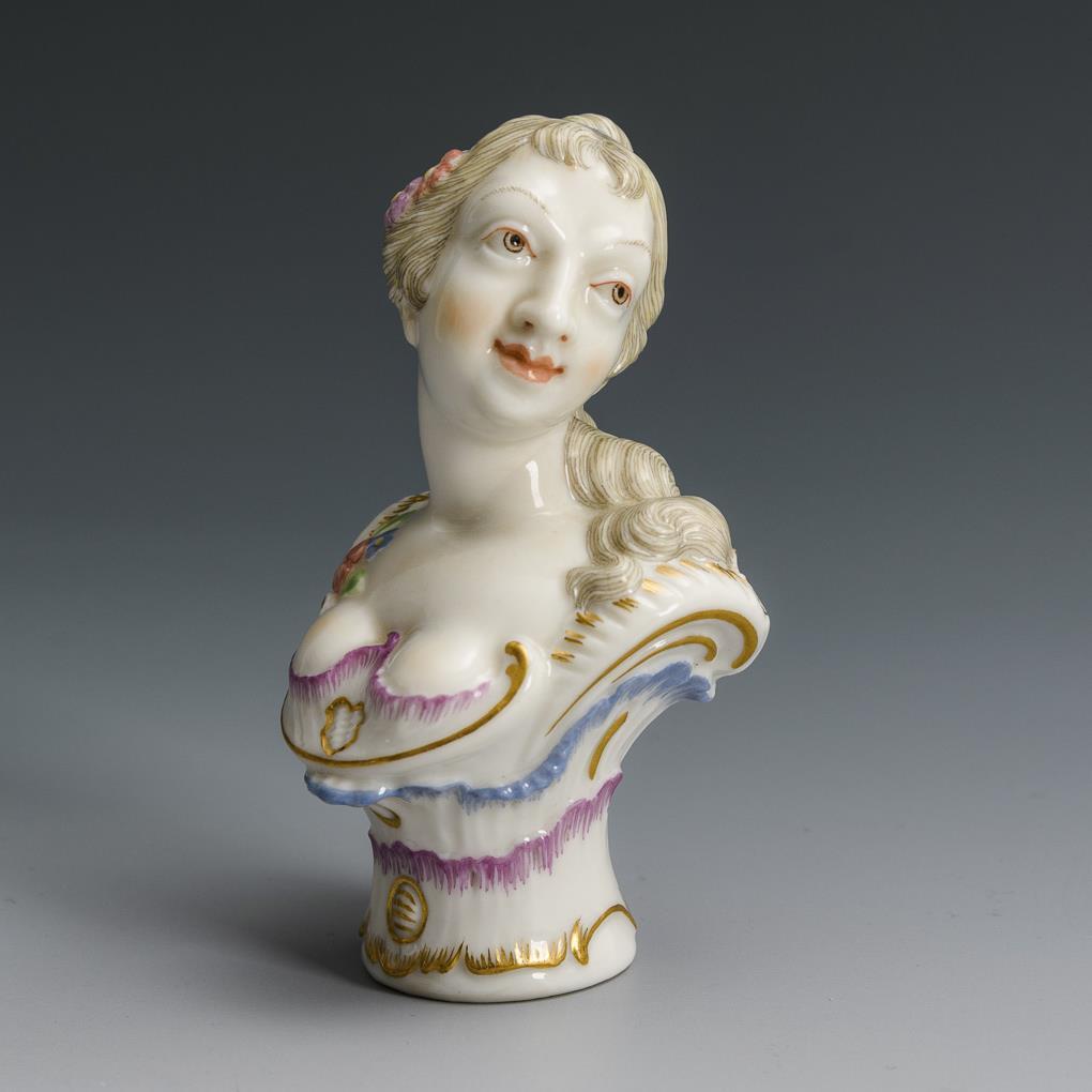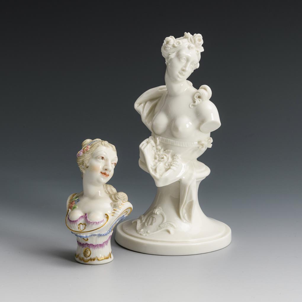 1x Modell-Nr. 367: Büste "Der Frühling" (H 14 cm). / 1x Modell-Nr. 588: Büste einer Rokokodame als Stockknauf.