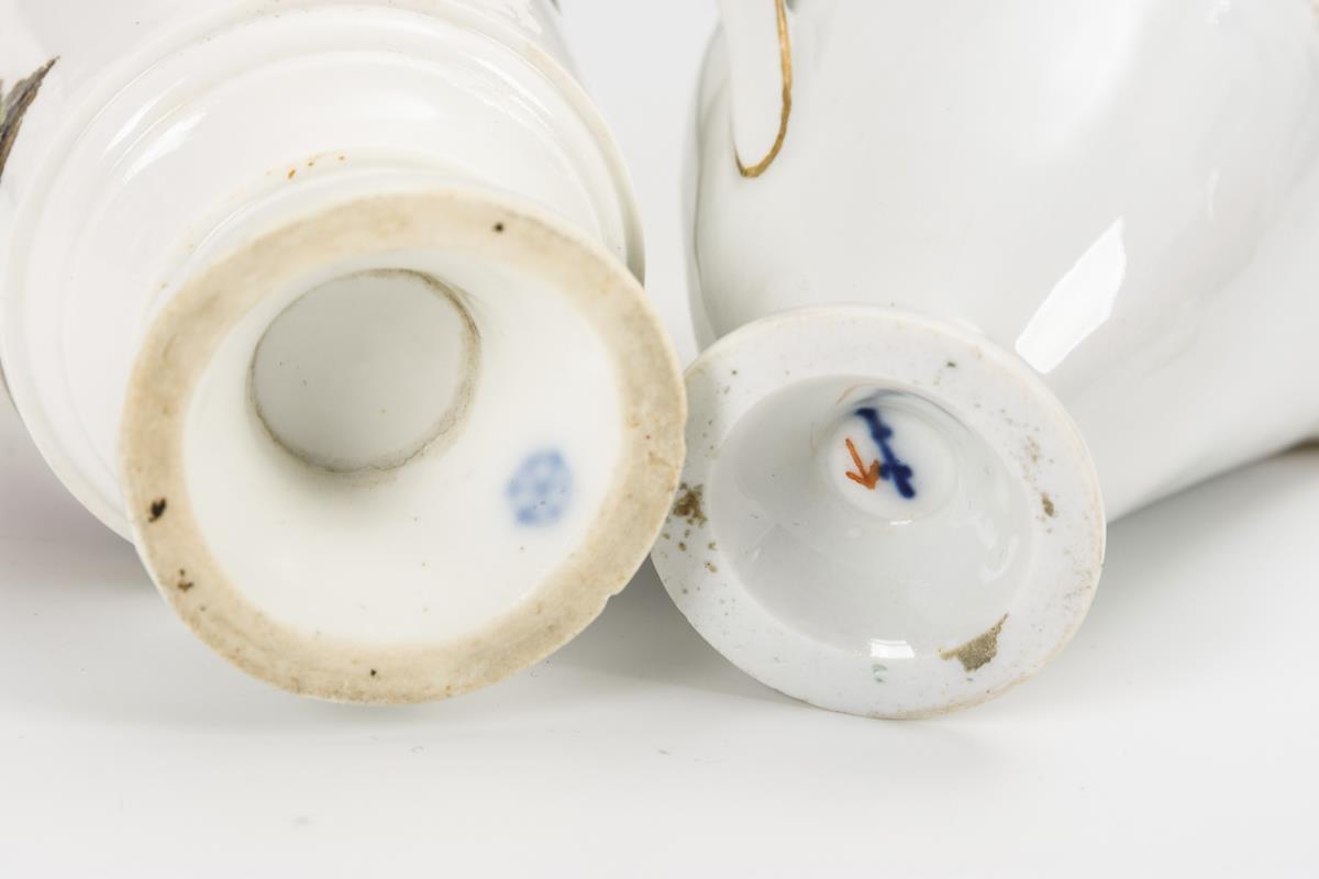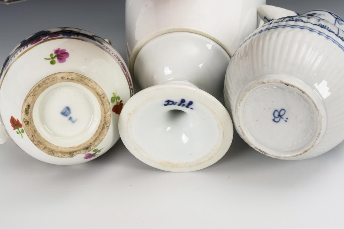 1x Wien: Birnkanne mit unterglasurblauer, farb- und goldstaffierter Kakiemonmalerei (H 18,5 cm). / 1x Limbach: gebrochen gerippte Birnkanne mit ausgetuschtem Strohblumendekor (H 17 cm). / 1x Höchst: Empire-Kännchen mit Bauernszene (H 14 cm). / 1x Dihl/Paris: Empire-Kanne mit Scharnierdeckel (H 31 cm). / 1x KPM: Empire-Kännchen mit Golddekor (H 9 cm). Henkel und Hals der Dihl-Kanne restauriert, Henkel des Höchst-Kännchens fehlt, Wien-Kanne mit je 1 Chip am Deckelrand und Stand, Gold etwas berieben.