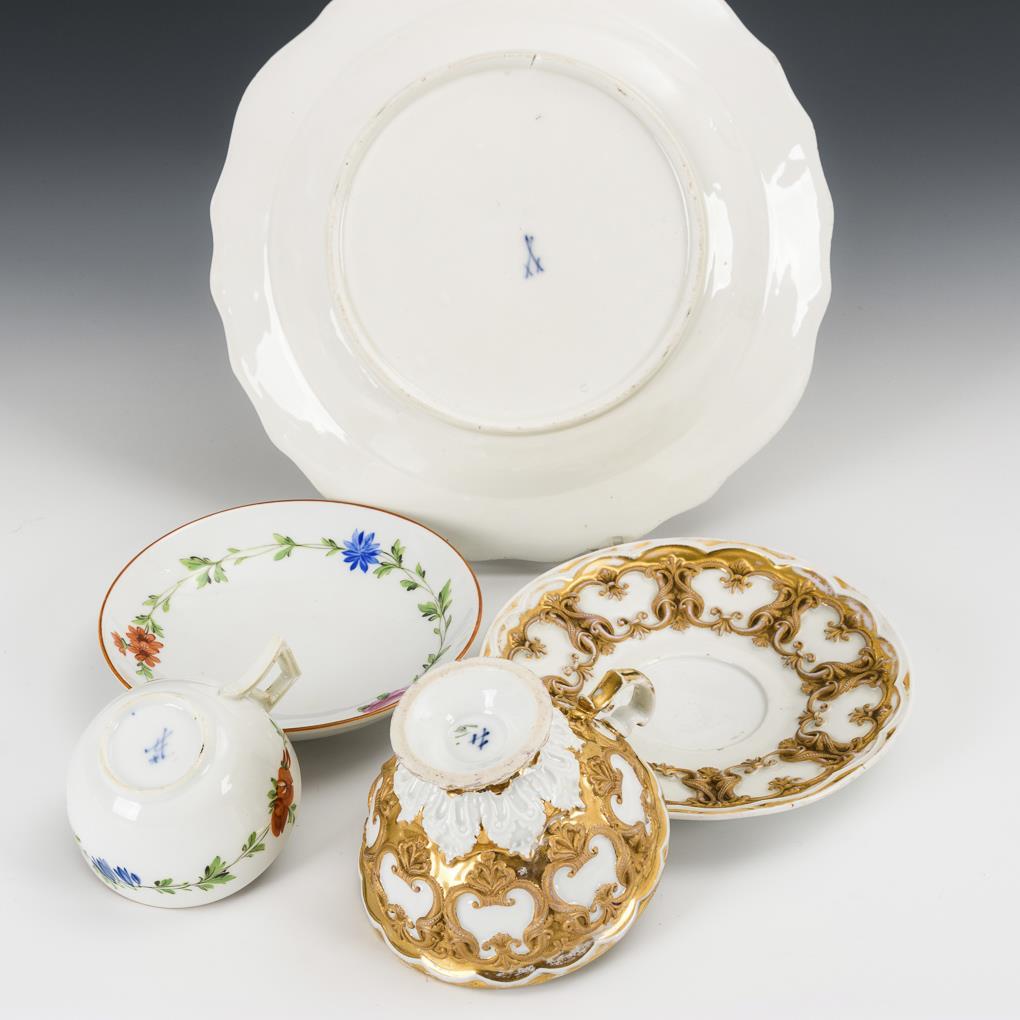 1x Teller Form "Neuozier" mit Blumenmalerei (Ø 24,5 cm). / 1x Tasse (H 5 cm) mit Blumenmalerei und originaler Untertasse (Ø 13,5 cm). / 1x Tasse (H 7 cm) und originale Untertasse (Ø 15,5 cm) mit goldbronziertem Ornamentrelief. Partieller Goldabrieb.