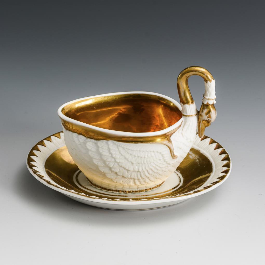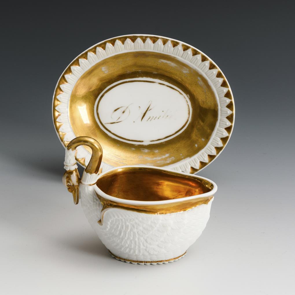 In der Gestalt eines Schwanes gestaltete Sauciere mit Biskuitwandung. Im Spiegel des Untertellers der Namenszug "D' Amilié". Gold berieben, Glasurhaarriss in der Untertasse.