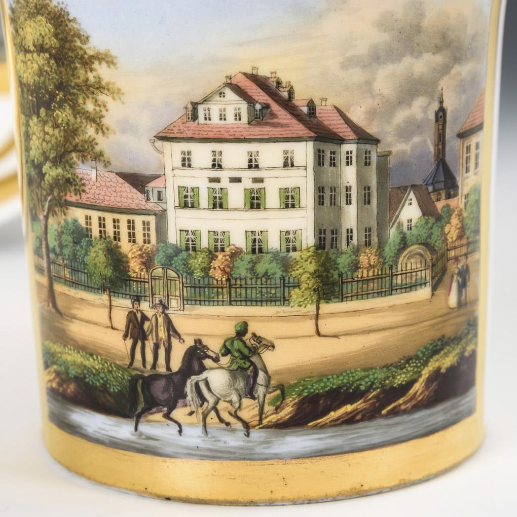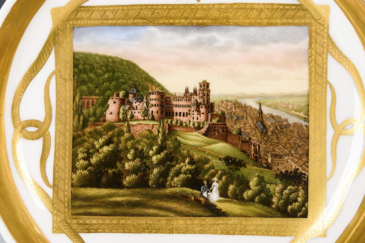 Kratertasse mit Palmettenhenkel: schauseitig eine goldgerahmte Rechteckkartusche mit der Darstellung eines herrschaftlichen Hauses. / Im Spiegel der Untertasse eine goldgerahmte Rechteckkartusche mit der Ansicht der Schlossruine Heidelberg. Minimaler Goldabrieb an der Tasse.