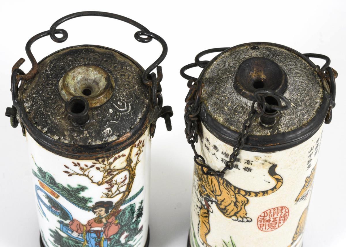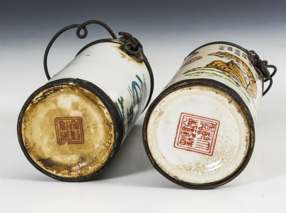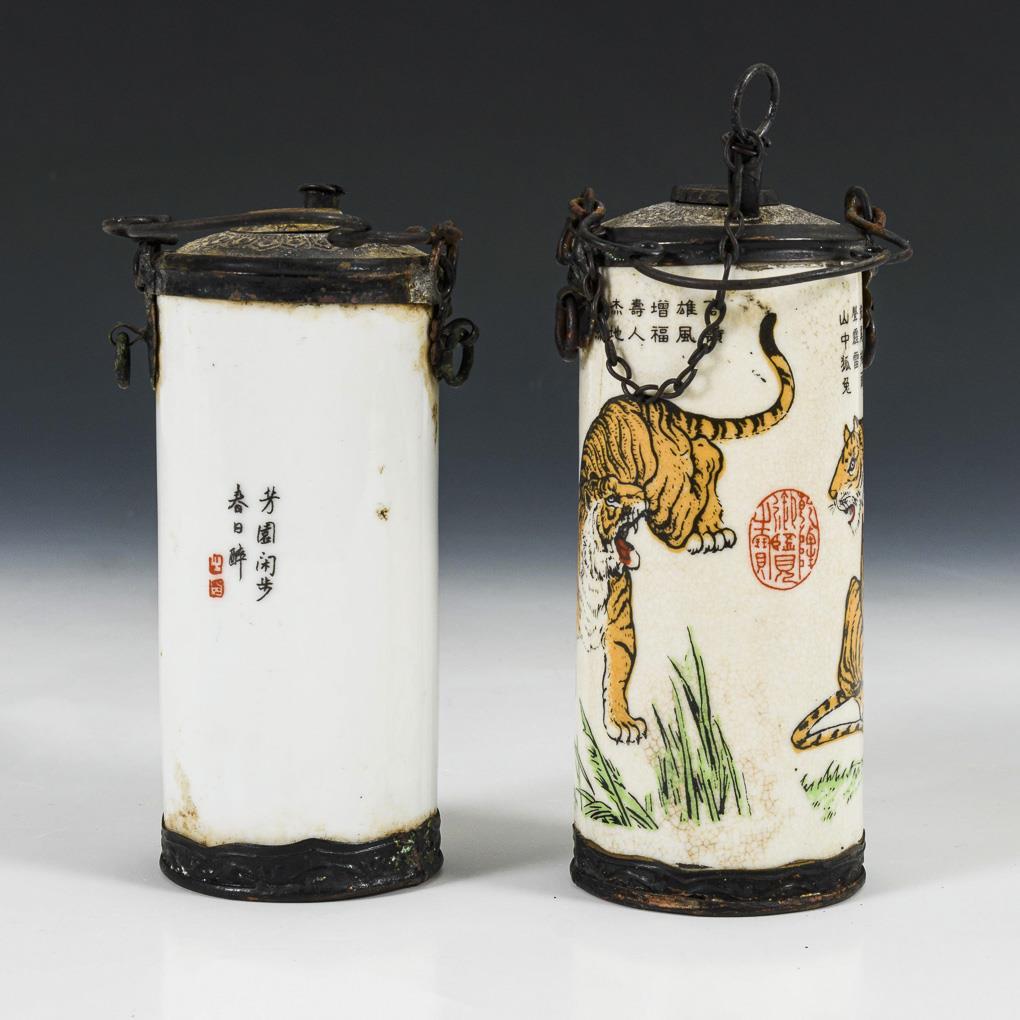Drei Tiger in verschiedenen Haltungen und zahlreiche Schriftzeichen. Glasur teils fein krakeliert. / Darstellung einer Dame in Gartenlandschaft, Schriftzeichen. Altersspuren und Patina.