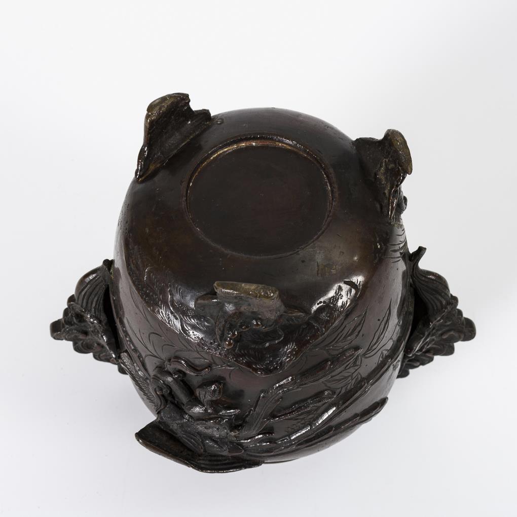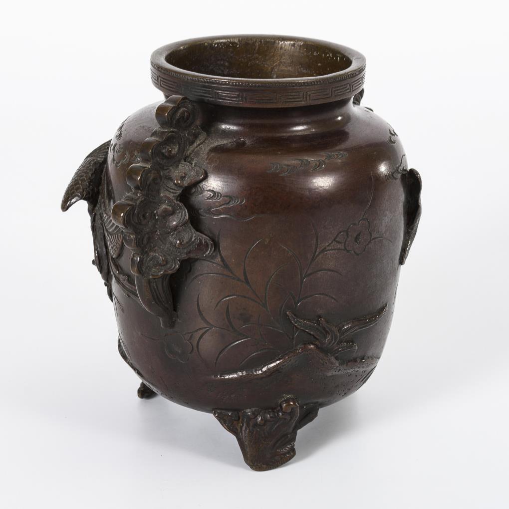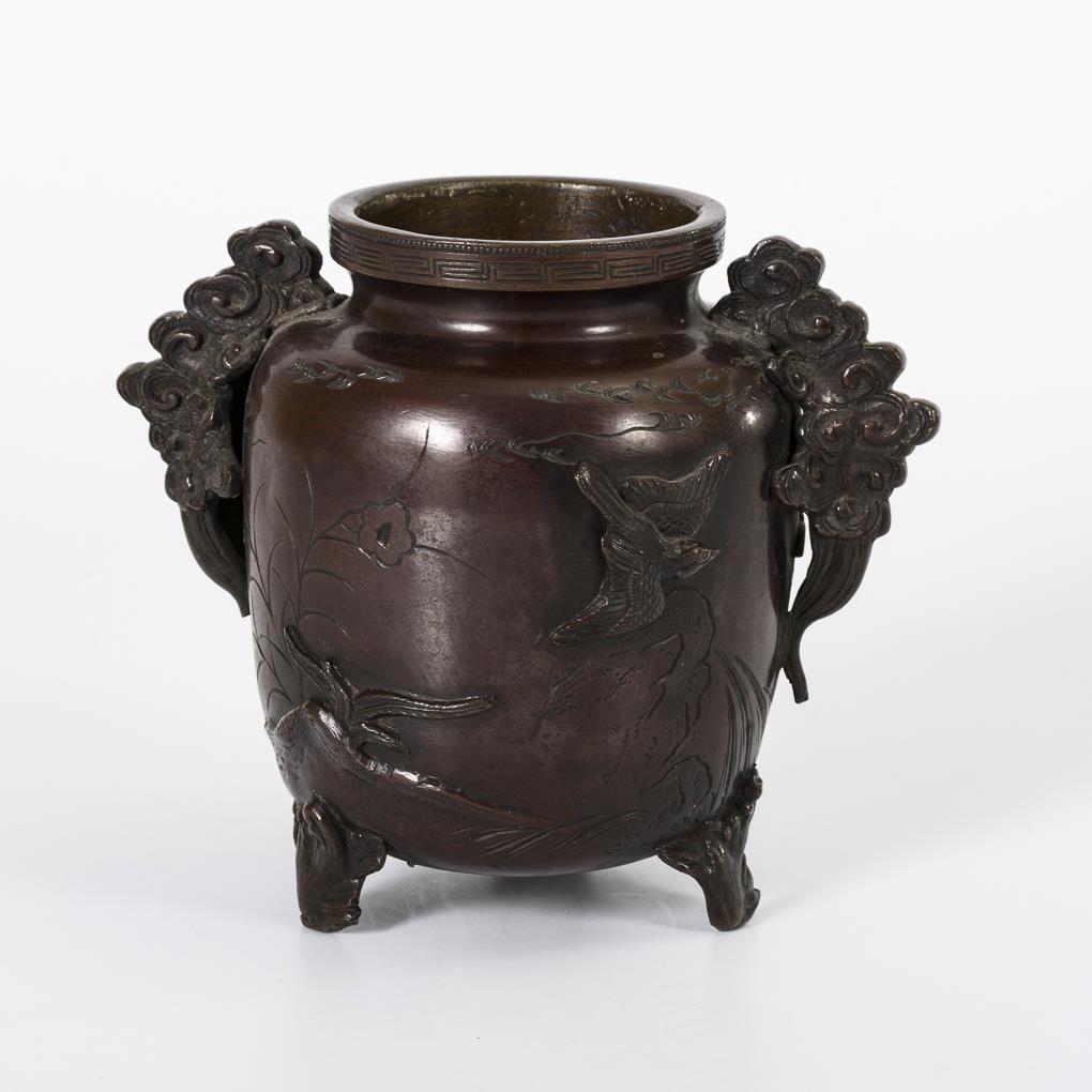 Dreibeiniges Gefäß mit zwei Handhaben als Wolkenformation. In kunstvoller Halbplastik Phönix und Spatz vor zarter Pflanzengravur auf der Wandung. Eine Handhabe mit Lötspur und winziger fehlender Spitze.