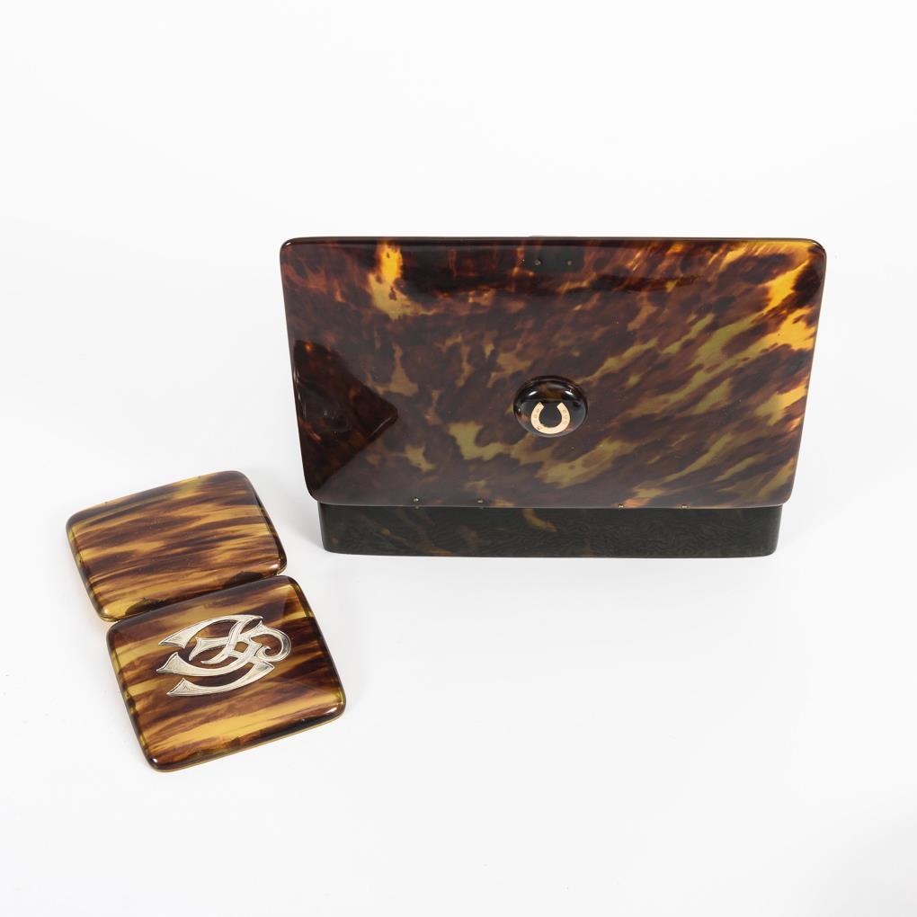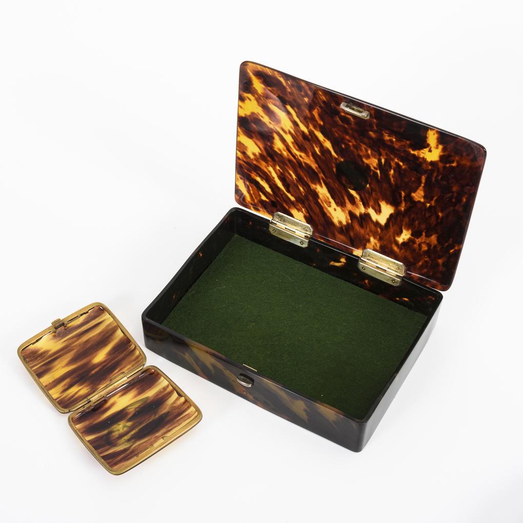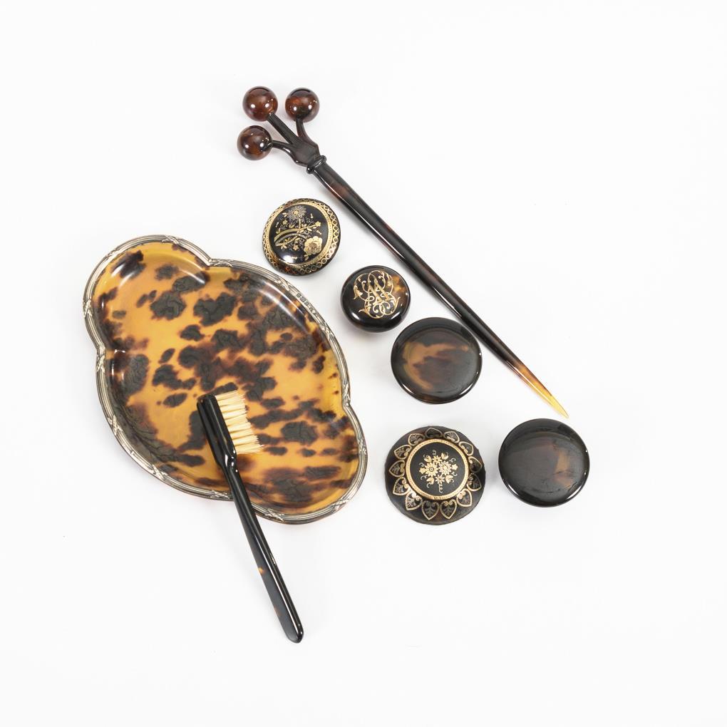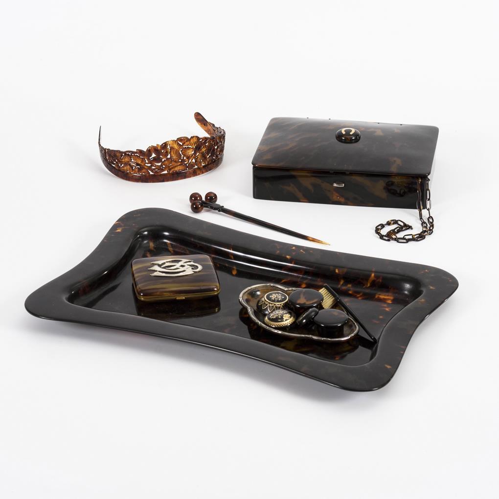 Großes Tablett, Schatulle mit eingelassenem Hufeisen aus Gold(?), Haarkrone mit geschnitztem Eichenlaub, Schälchen mit Silbermontierung (engl. gepunzt), Zigarettenetui mit appliziertem Monogramm "HM", 2 Stopfen, 1 Haarnadel, 1 Knopf, 1 Brosche, 1 runde Applik (3x mit Piqué in Gold? und Silber?), 1 Zahnbürste, 1 Kette.