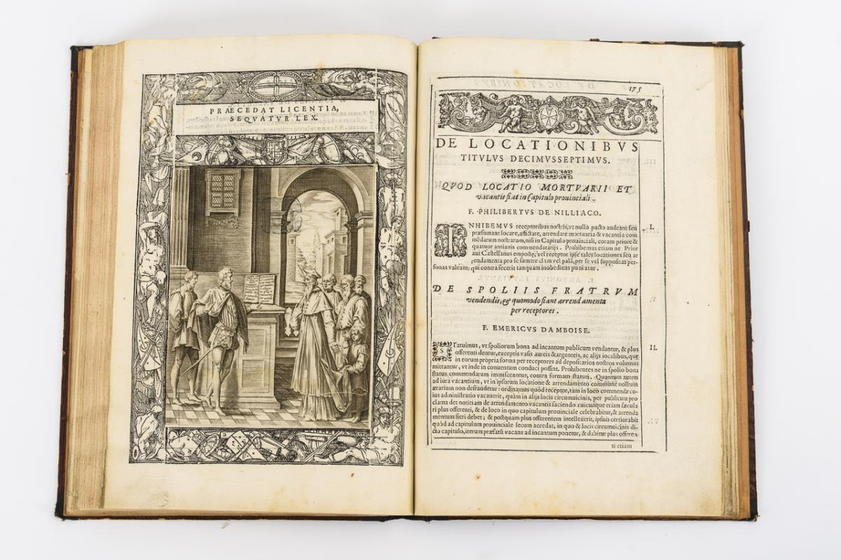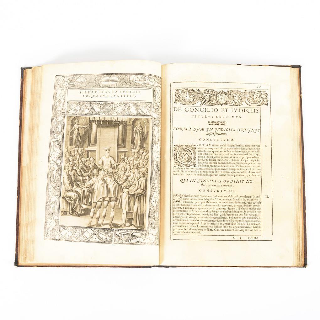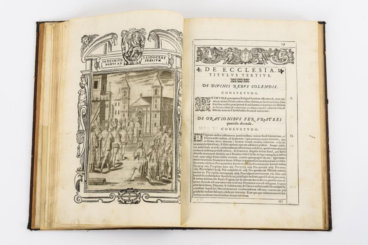 Statuten des Malteserordens. Der ursprünglich zur Versorgung hilfsbedürftiger Kreuzritter im Heiligen Land gegründete Orden entwickelte sich zu einem einflussreichen militärischen Orden. Die Mitglieder stammten aus hochrangigen Adelshäusern, sodass der Orden auch politisch eine große Rolle spielte. Titelkupfer, Kupferstich, (2 Seiten), Kupferstich, 12 Blätter (mit 48 bezeichneten Porträts von Malteserrittern), 204 Seiten inclusive 20 Kupferstichen in Holzschnittrahmen, 16 Seiten Index. Die Kupferstiche illustrieren die Geschichte des Malteserordens, inclusive der Karten von Malta und Valetta. Die Porträtstiche sind von Philippe Thomassin. Widmung/Vorwort wurde von Io. Baptista Canobius geschrieben. Kollationiert: Ab Seite 164 sind die Seiten fleckig (durch vergossene Flüssigkeit), aber keine große Beeinträchtigung. 3 Blätter verheftet aber vorhanden. Es fehlt S. 161/162. Einige Seiten streifenweise hinterklebt. Jünger nachgebunden. Sonst altersgemäßer guter Zustand.