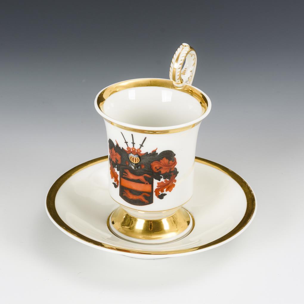 Gefußte Kratertasse mit Palmettenhenkel. Schauseitig das unterseitig bezeichnete Wappen der Adelsfamilie von Kleist. Unterseitig kleiner Chip am Tassenfuß.