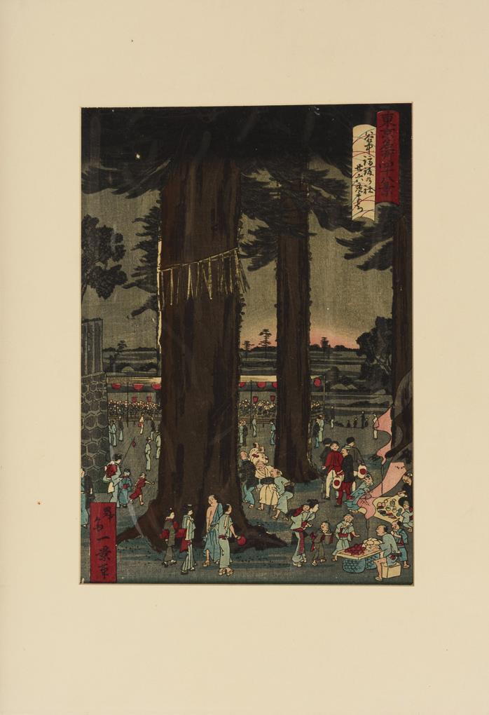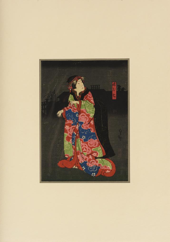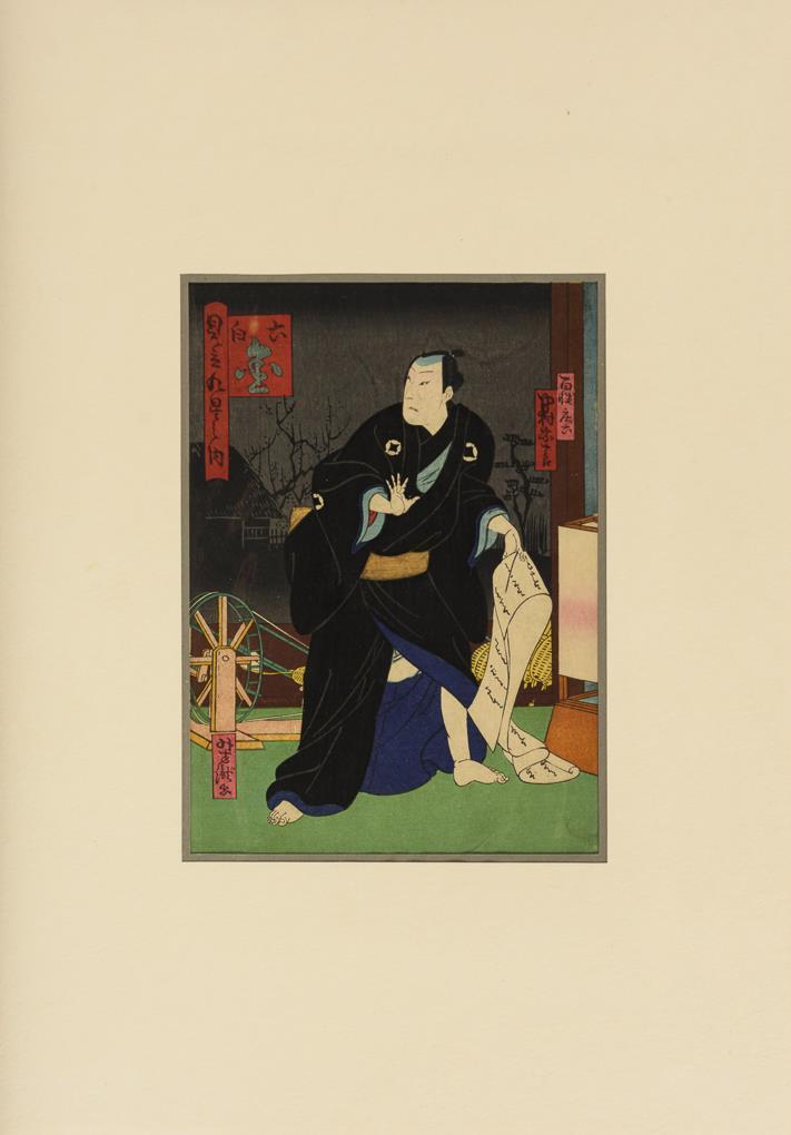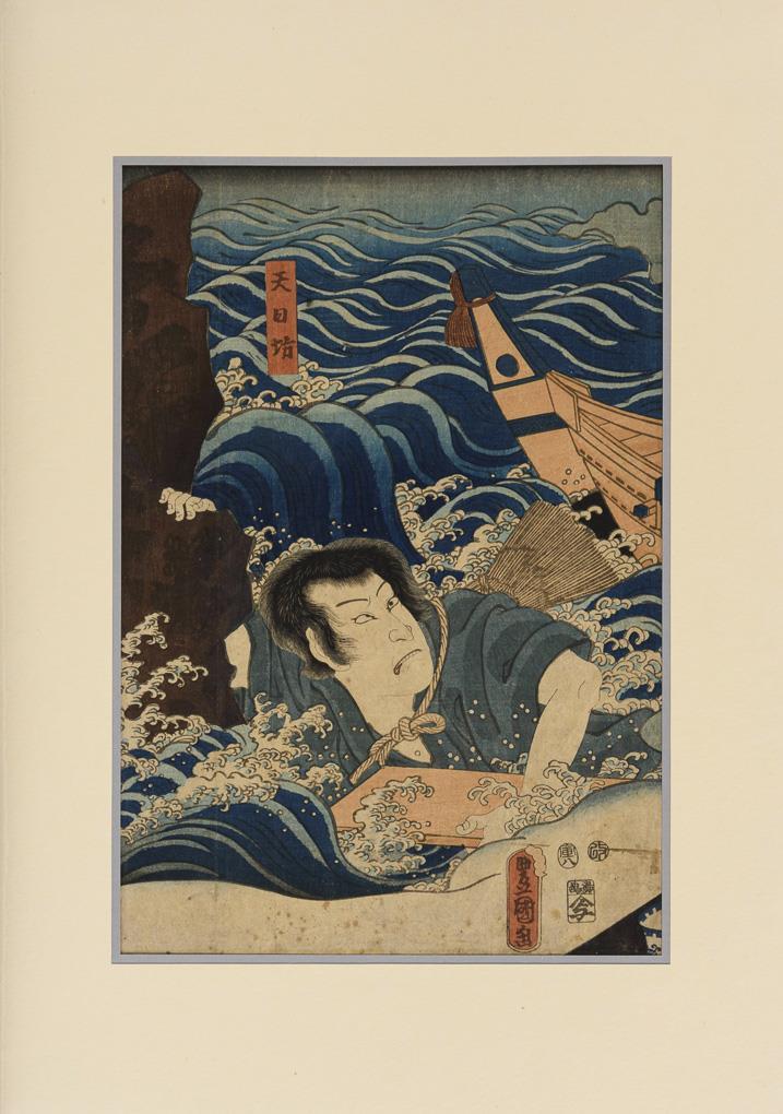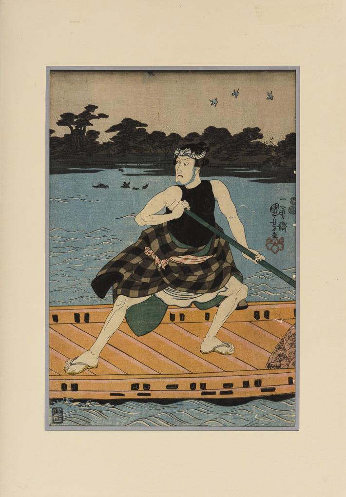 Utagawa Kuniyoshi: Onoe Kikugorô III als Sarushima Sota (Bootsführer). 1847, Verlag: Horimasa. / Kunisada: Obi-hiki-Szene (Vergewaltigung). Signatur: Toyokuni, ca. 1860. (Frau im Boot, mit offenem Obi). / Kunisada: Schiffbrüchiger am Felsen. 1854. / Yoshitaki: Mann mit ausführlichem Liebesbrief. Osaka-Schule. Ca. 25 x 19 cm. / Sadahiro II: Arashi Rikan IV als Musume Oshichi ... Ca. 25 x 18 cm. / Shosai Ichikage: Blatt aus 48 Ansichten von Tokyo, 1871. Kleines Loch oben links.