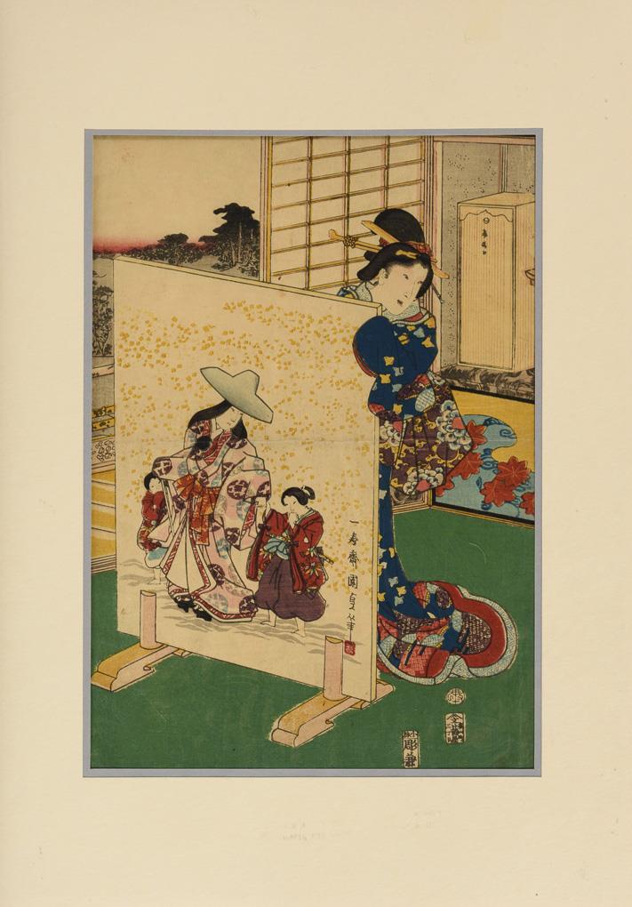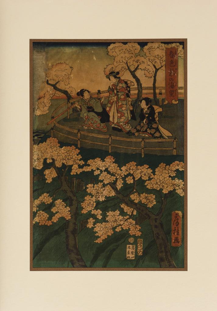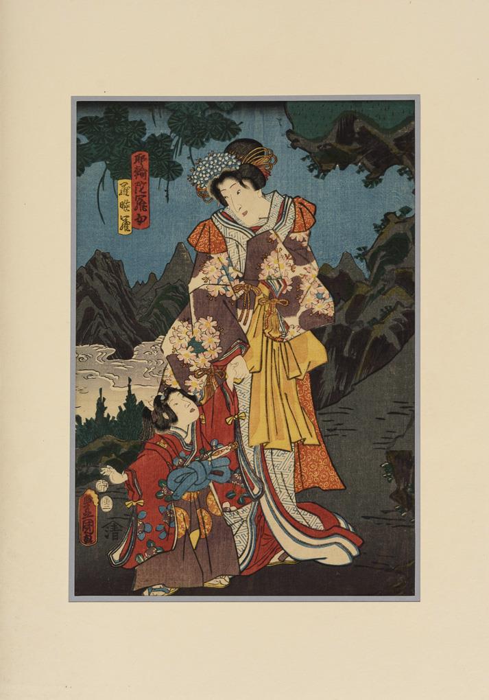 Fusata E: Pflaumenblüten im Frühling, 1865. Im oberen Bereich kleine beriebene Stellen. / Toyokuni III: Dame und Kind im Gebirge. 1854. / Utagawa Kunisada: Danshichi Kurobei und Issun Tokuhei. Signiert Toyokuni, Aratame-Siegel, ca. 1849. / Kunisada II: Vornehme Dame mit Stellbild der Adeligen Tokiwa-Gosen mit den drei Kindern .... Um 1860. / Kunisada: Frau Okaru in der Sänfte. 1854. / Kunishika: Der vornehme Yoheiji verteidigt die Prinzessin Hanako Gosen. Ca. 1860. Winzige Fraßspur im unteren Drittel.