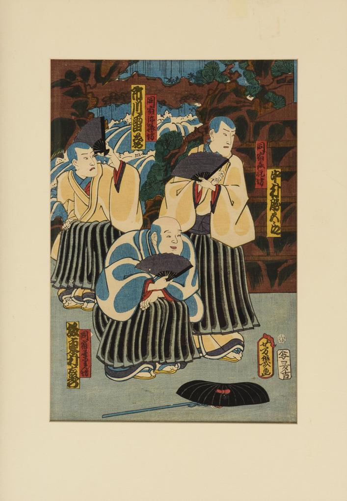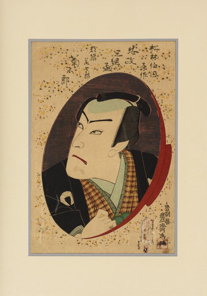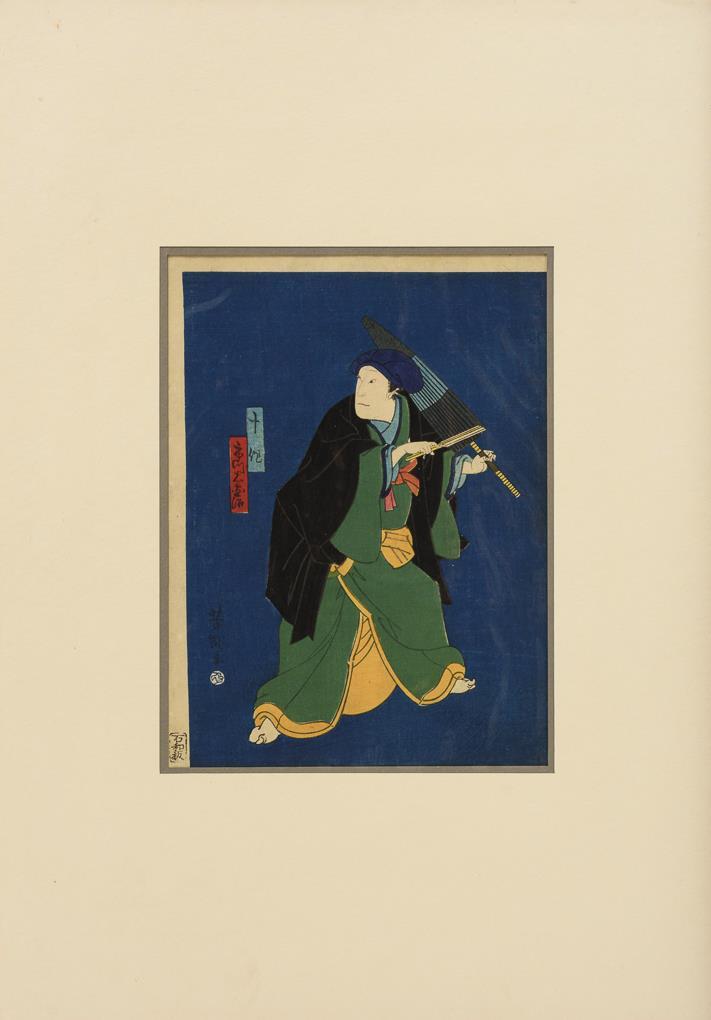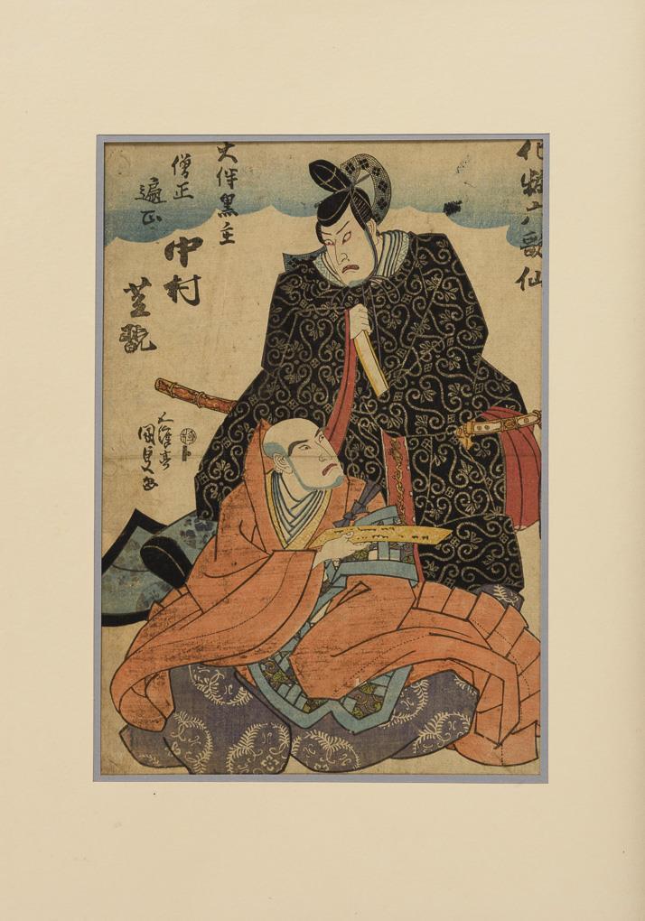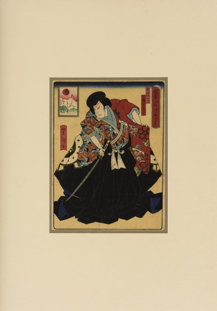 Yoshitaki: Schaupieler in der Rolle des Jussako, Osaka-Schule, Chuban-Format. Ca. 25 x 19 cm. / Kunisada: Die Dichter Sojo Henjo und Otomo no Kuronushi, ca. 1830, Verlag: Yamagushiya Tobei. / Yoshitaki: Der Schauspieler Mimaso Daigoro als Musashibo Benkei, in der Serie: Mitate Iroha Tatoe. Osaka-Schule, Chuban-Format. / Unsigniert: "Shinie", Gedächtnisbild für einen Schauspieler, 1856. / Tosai: "Porträt des Schauspielers Onoe Kikugoro V. in einer Sakeschale". Ein Schriftblock unkenntlich gemacht. / Ichiyeisai Yoshiiku: Die Schauspieler Ichikawa Raizo, Bando Uzayemon, Nakamura Kunnanosake in Rollen von Mönchen. Ca. 35 x 24 cm.