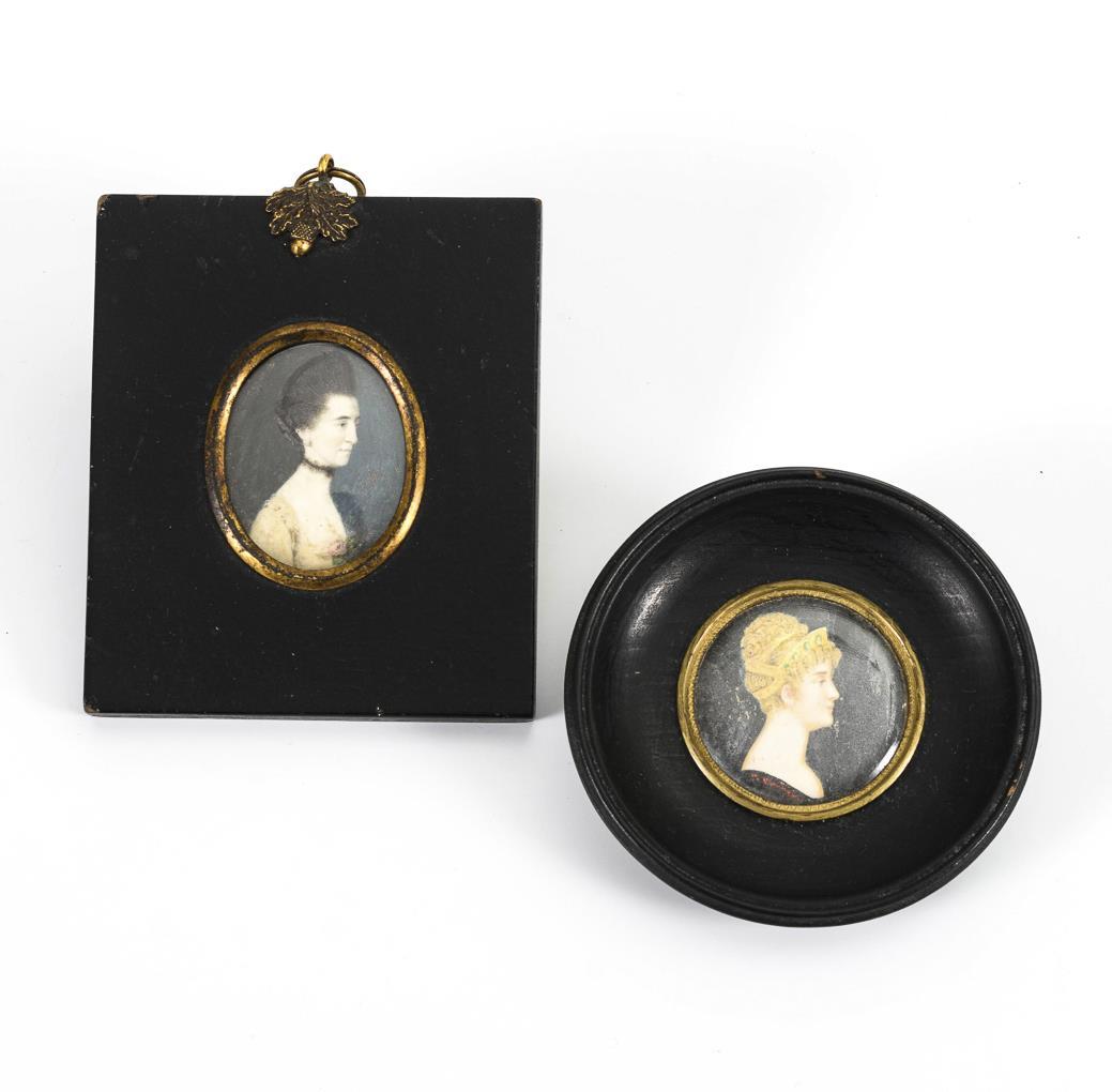 Je Tempera/Elfenbein(?), ebonisierte und verglaste Rahmen aus Papiermaché bzw. Holz. 5 x 4 cm bzw. Ø 4,5 cm, Rahmen 10 x 9 cm bzw. Ø 9 cm.