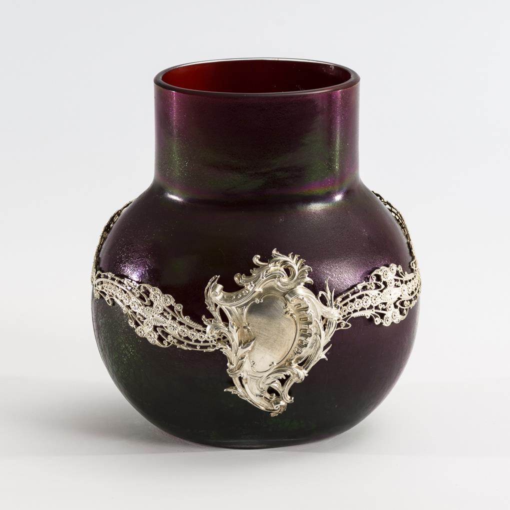 Farbloses, rubinrot unterfangenes Glas mit silbergelbem Überfang, irisiert; lose aufgesetzte versillberte Metallmontur. H 17 cm.