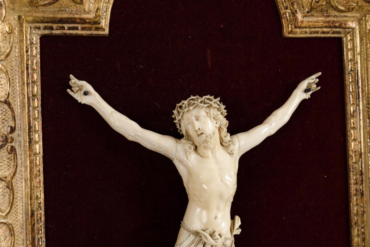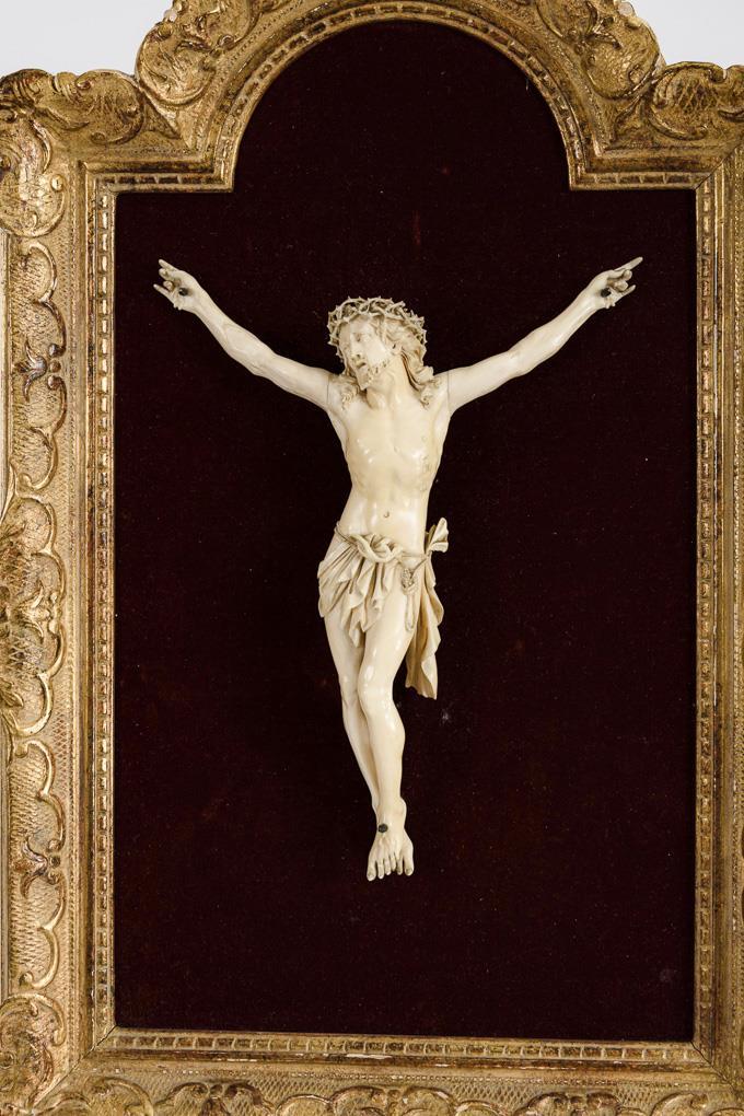 Nach dem Vorbild von Alessandro Algardi sehr fein geschnitzter Christus patiens im Dreinagel-Typus mit zur Seite gedrehtem Kopf und brechenden Augen sowie offenem Mund. Um den athletischen Körper mit leicht gelängten Proportionen ist das faltenreiche Hüfttuch mit einer Kordel geschlungen. 2 Finger geklebt, kaum Fehlstellen an der Dornenkrone. Kleinere Abplatzer am Rahmen.