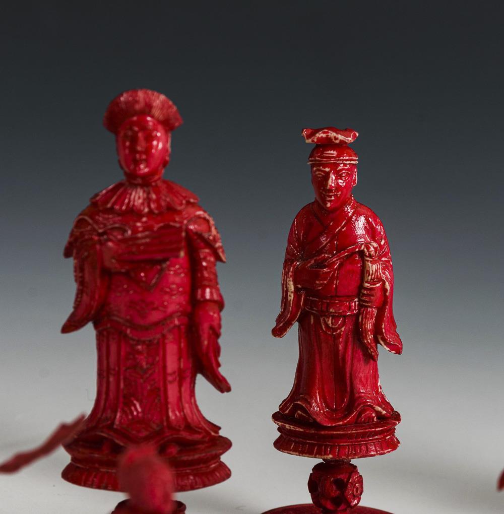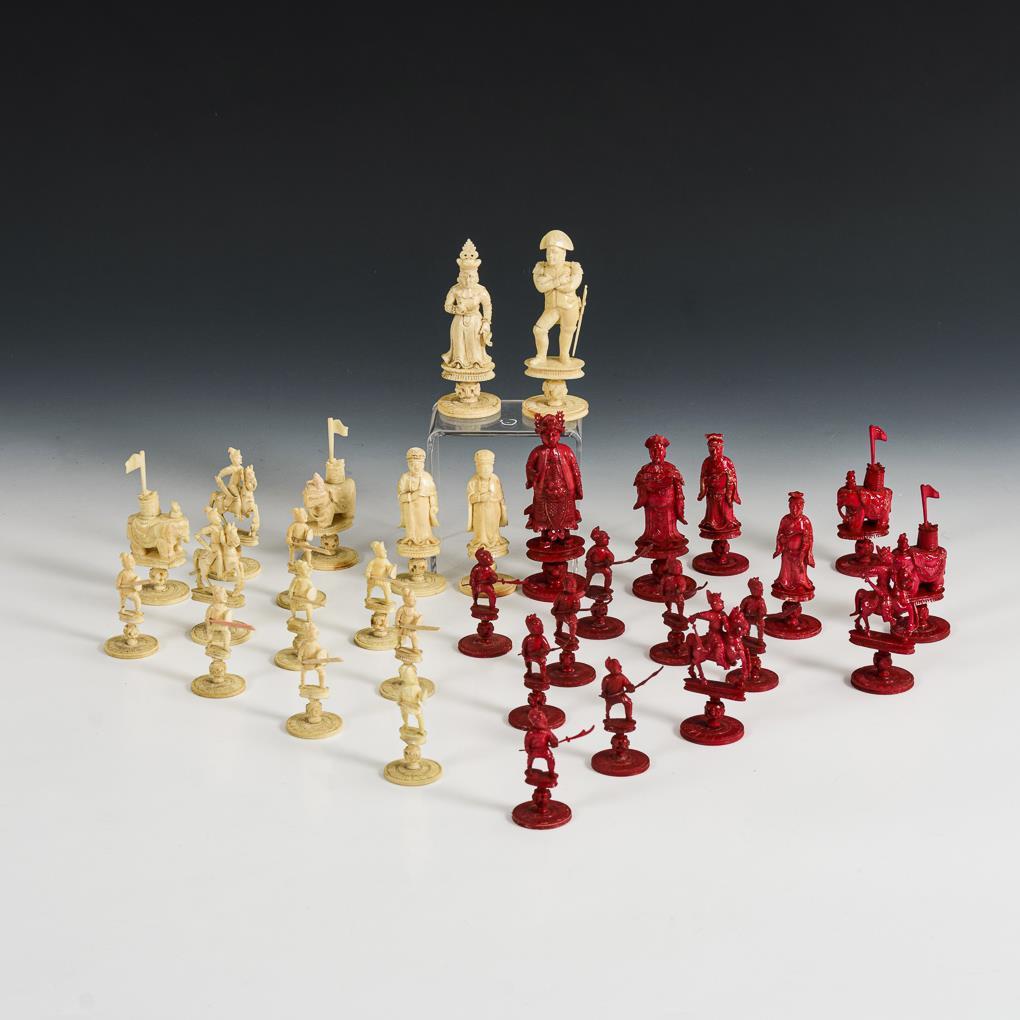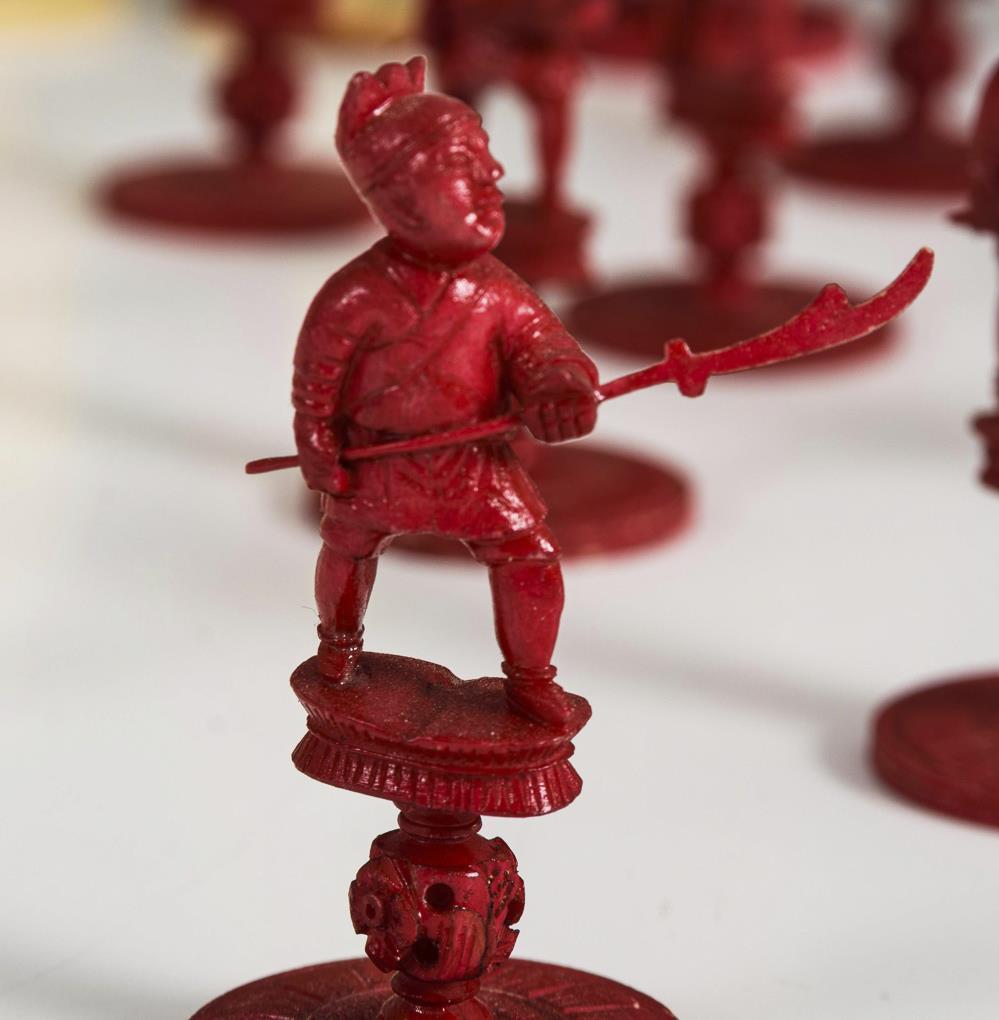 Mit asiatischen Figuren in Rot und Weiß. Figuren teils ergänzt und übermalt, zahlreiche Stangenwaffen vorhanden. Fehlender weißer König durch Napoleon-Figur aus Elfenbein ersetzt.