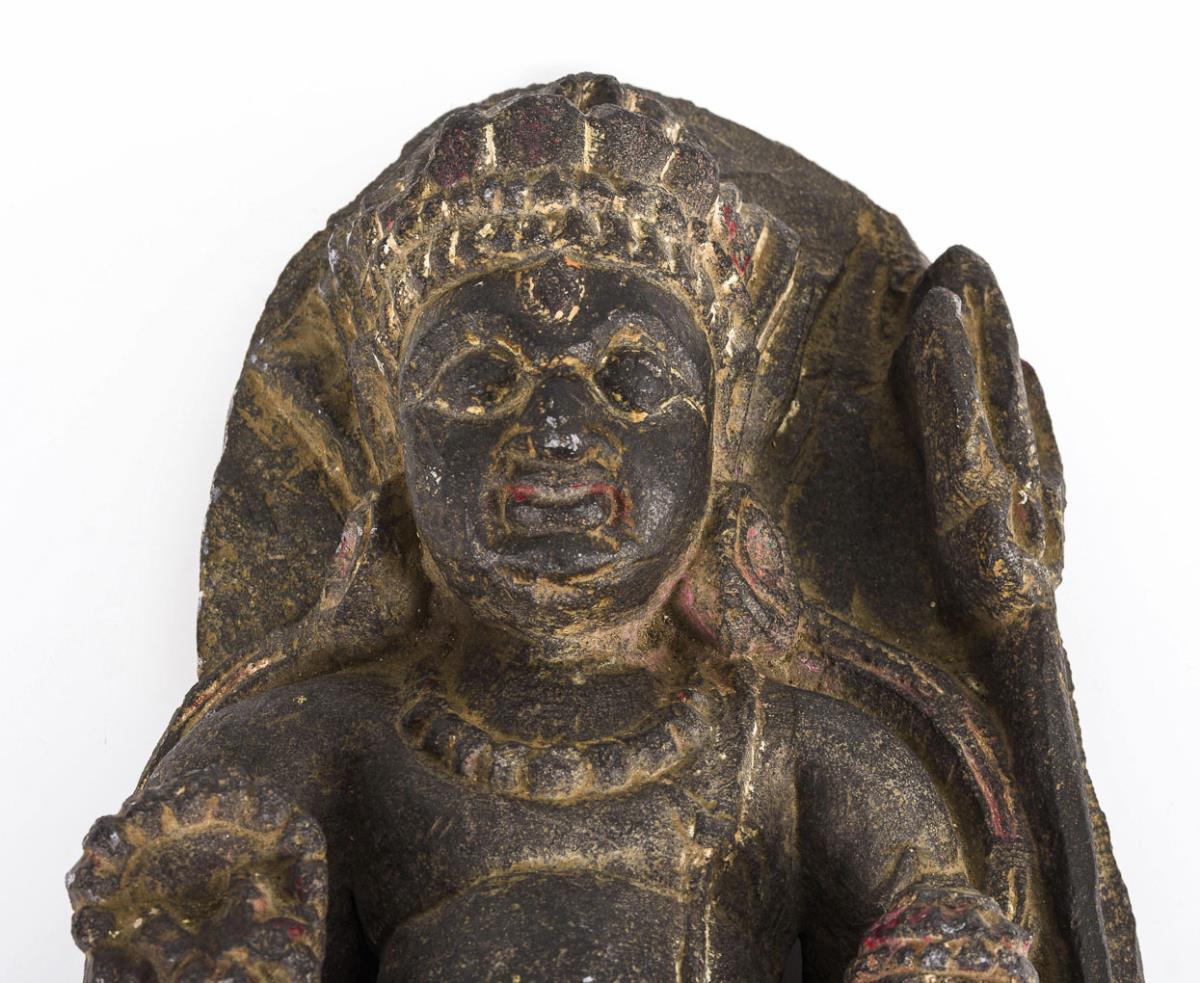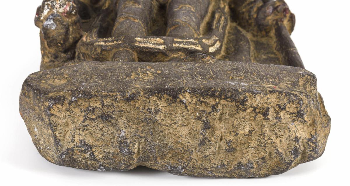 Stehende, vierarmige Gottheit mit Dreizack, Kette, Schale und weiterem Gegenstand in den Händen. Wohl ursprünglich farbig gefasst. Reste roter und weißer Farbe.