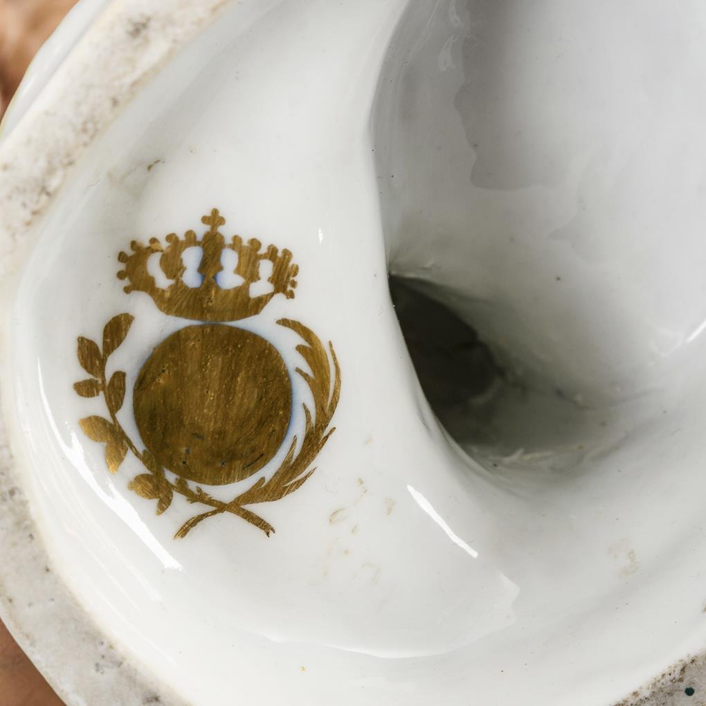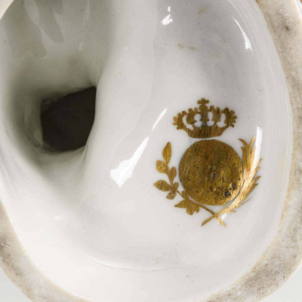 Auf einem Stein stehende Dose mit Landschafts- und Kauffahrteimalerei, daran ein Indianer mit Zitrone als Allegorie für Amerika bzw. eine Afrikanerin als Allegorie für Afrika stehend. 1x Finger der rechten Hand bestoßen, kleiner Chip an 1 Dosenrand, minimaler Goldabrieb.