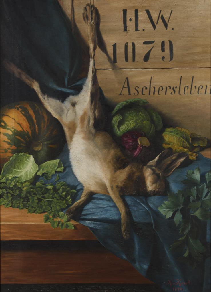 Kürbis, Salatkopf und Rotkohl neben einem Hasen vor einer Kiste. Leichte Altersspuren.