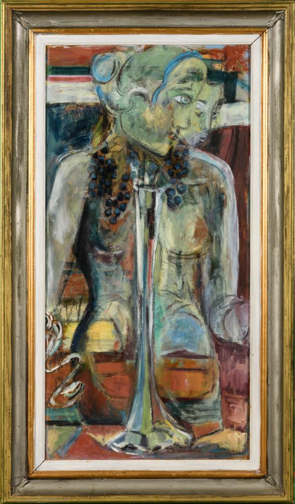 Gläsern wirkender expressiver Frauenakt mit einer weiteren Frau dahinter, vor einem Tisch mit sehr schlanker Glasvase, aus der Reben mit Trauben ragen.