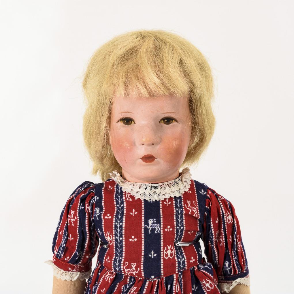 Kurbelkopf mit einer Hinterkopfnaht, blonde Echthaarperücke. Schlanker Stoffkörper mit Schlenkerarmen, Beine mit Scheibengelenken. Kurzes, blau-rot gestreiftes Kleidchen. Größere Farbabplatzer am Kopf (im Nackenbereich), Wangen berieben, Bemalung der Augen mit kleinen Abplatzern.