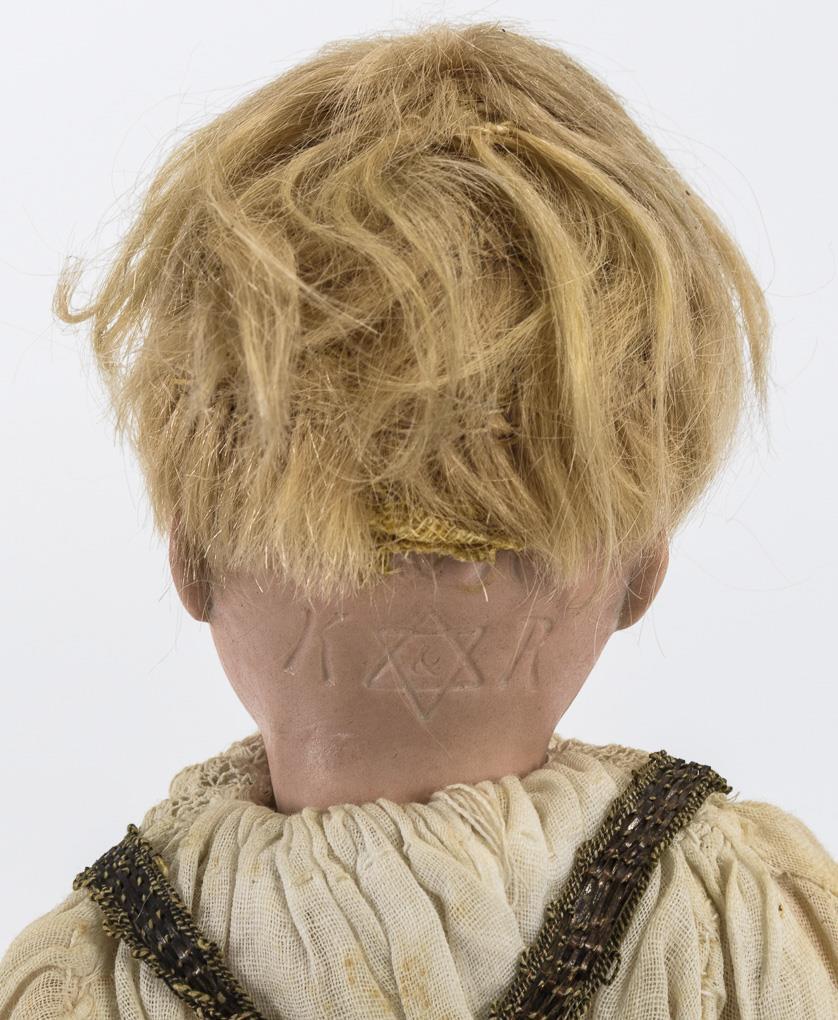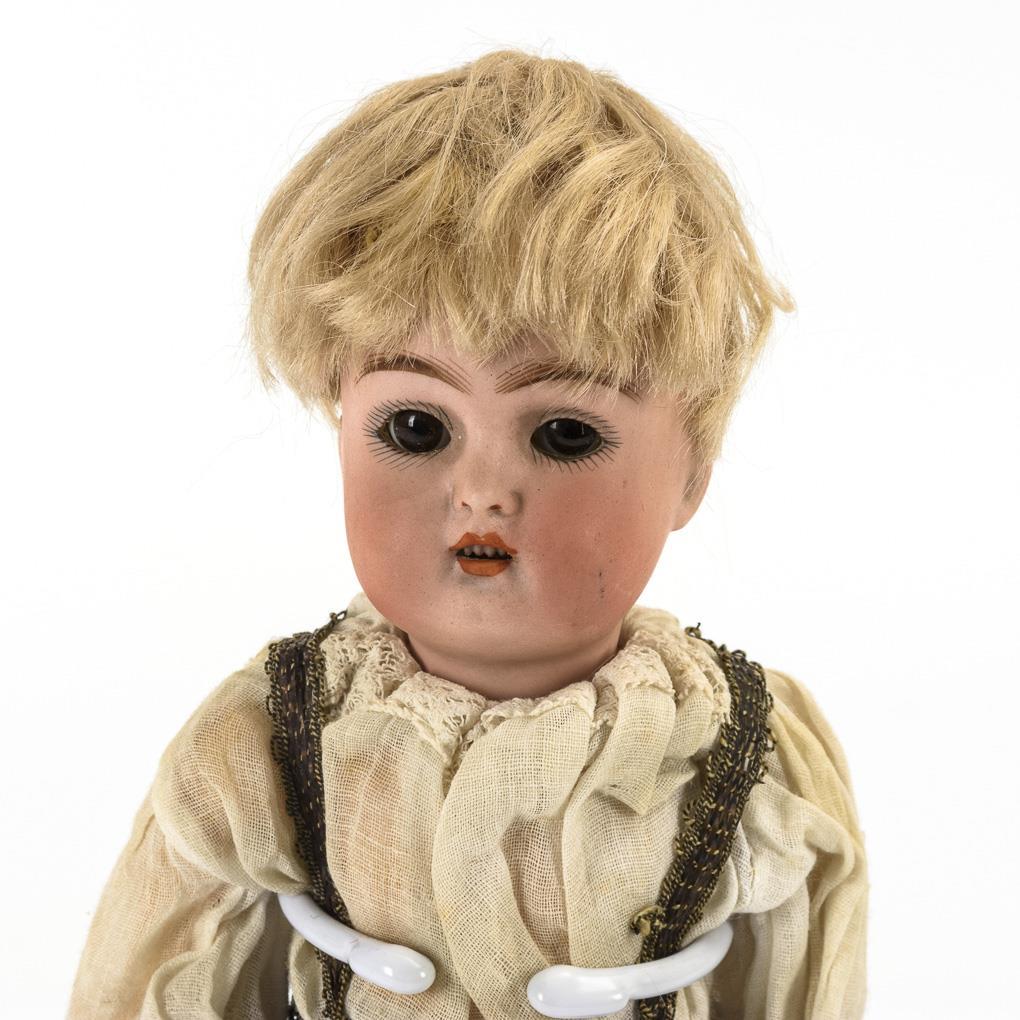 Kurbelkopf, braune Schlafaugen, blonde Mohairperücke. 5-teiliger Stehpuppenkörper mit modellierten Schuhen und Strümpfen. Weißes Hemd, schwarze Samthose. Perücke fest: Kopf nicht durchleuchtet. Minimal brandrissig hinter den Ohren.